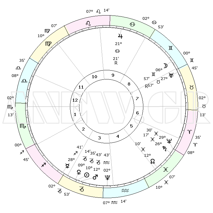 | | ΘΕΣΕΙΣ ΠΛΑΝΗΤΩΝ ΑΣΤΡΟΛΟΓΙΚΟΥ ΧΑΡΤΗ ΤΗΣ ΣΤΙΓΜΗΣ ΑΥΤΗΣ | | | | Πλανήτης | Ζώδιο | Μοίρες | Δεκαήμ. | Σε οίκο | Απόκλιση | | Ακμές των οίκων | | Ηλιος | Αιγόκερως | 10°48' | Δεύτερο | 1 | 23 S 00 | | 1ος | 06°12' | Αιγόκερως | | Σελήνη | Δίδυμοι | 10°08' | Δεύτερο | 5 | 26 N 58 | | 2ος | 14°56' | Υδροχόος | | Ερμής | Τοξότης | 29°01' | Τρίτο | 12 | 24 S 01 | | 3ος | 25°13' | Ιχθείς | | Αφροδίτη | Αιγόκερως | 09°30' | Πρώτο | 1 | 23 S 36 | | 4ος | 28°06' | Κριός | | Αρης | Αιγόκερως | 12°52' | Δεύτερο | 1 | 23 S 42 | | 5ος | 23°28' | Ταύρος | | Δίας | Καρκίνος | 21°19'R | Τρίτο | 7 | 21 N 59 | | 6ος | 14°56' | Δίδυμοι | | Κρόνος | Ιχθείς | 26°18' | Τρίτο | 3 | 03 S 33 | | 7ος | 06°12' | Καρκίνος | | Ουρανός | Ταύρος | 27°56'R | Τρίτο | 5 | 19 N 30 | | 8ος | 14°56' | Λέων | | Ποσειδώνας | Ιχθείς | 29°31' | Τρίτο | 3 | 01 S 25 | | 9ος | 25°13' | Παρθένος | | Πλούτωνας | Υδροχόος | 02°44' | Πρώτο | 1 | 23 S 13 | | 10ος | 28°06' | Ζυγός | | Β. Δεσμός | Ιχθείς | 12°09' | Δεύτερο | 2 | 07 S 00 | | 11ος | 23°28' | Σκορπιός | | Ωροσκόπος | Αιγόκερως | 06°12' | Πρώτο | | | 12ος | 14°56' | Τοξότης | | Μεσουράνημα | Ζυγός | 28°06' | Τρίτο | | | |