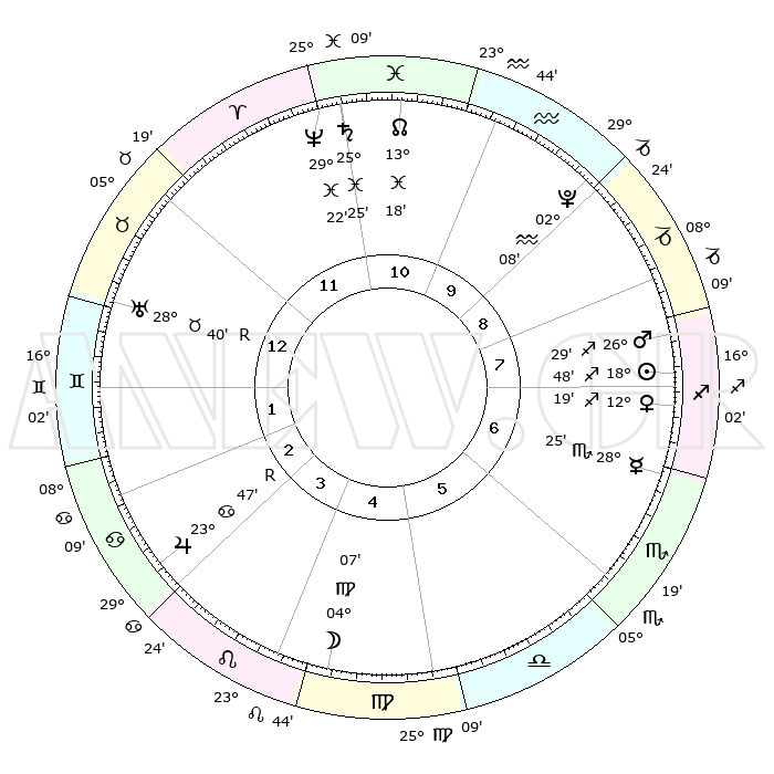 | | ΘΕΣΕΙΣ ΠΛΑΝΗΤΩΝ ΑΣΤΡΟΛΟΓΙΚΟΥ ΧΑΡΤΗ ΤΗΣ ΣΤΙΓΜΗΣ ΑΥΤΗΣ | | | | Πλανήτης | Ζώδιο | Μοίρες | Δεκαήμ. | Σε οίκο | Απόκλιση | | Ακμές των οίκων | | Ηλιος | Τοξότης | 19°07' | Δεύτερο | 3 | 22 S 59 | | 1ος | 21°31' | Παρθένος | | Σελήνη | Παρθένος | 08°12' | Πρώτο | 12 | 08 N 54 | | 2ος | 17°26' | Ζυγός | | Ερμής | Σκορπιός | 28°47' | Τρίτο | 3 | 17 S 55 | | 3ος | 17°31' | Σκορπιός | | Αφροδίτη | Τοξότης | 12°42' | Δεύτερο | 3 | 21 S 59 | | 4ος | 20°27' | Τοξότης | | Αρης | Τοξότης | 26°43' | Τρίτο | 4 | 24 S 08 | | 5ος | 23°35' | Αιγόκερως | | Δίας | Καρκίνος | 23°46'R | Τρίτο | 11 | 21 N 32 | | 6ος | 24°21' | Υδροχόος | | Κρόνος | Ιχθείς | 25°26' | Τρίτο | 7 | 03 S 58 | | 7ος | 21°31' | Ιχθείς | | Ουρανός | Ταύρος | 28°39'R | Τρίτο | 9 | 19 N 39 | | 8ος | 17°26' | Κριός | | Ποσειδώνας | Ιχθείς | 29°22' | Τρίτο | 7 | 01 S 29 | | 9ος | 17°31' | Ταύρος | | Πλούτωνας | Υδροχόος | 02°08' | Πρώτο | 5 | 23 S 21 | | 10ος | 20°27' | Δίδυμοι | | Β. Δεσμός | Ιχθείς | 13°17' | Δεύτερο | 6 | 06 S 34 | | 11ος | 23°35' | Καρκίνος | | Ωροσκόπος | Παρθένος | 21°31' | Τρίτο | | | 12ος | 24°21' | Λέων | | Μεσουράνημα | Δίδυμοι | 20°27' | Τρίτο | | | |
