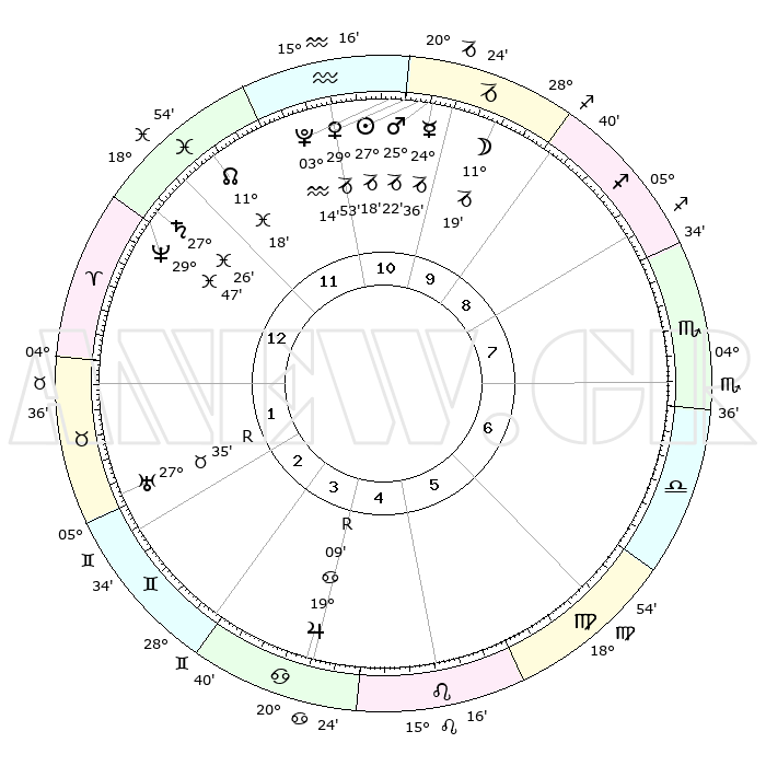 | | ΘΕΣΕΙΣ ΠΛΑΝΗΤΩΝ ΑΣΤΡΟΛΟΓΙΚΟΥ ΧΑΡΤΗ ΤΗΣ ΣΤΙΓΜΗΣ ΑΥΤΗΣ | | | | Πλανήτης | Ζώδιο | Μοίρες | Δεκαήμ. | Σε οίκο | Απόκλιση | | Ακμές των οίκων | | Ηλιος | Αιγόκερως | 27°13' | Τρίτο | 11 | 20 S 43 | | 1ος | 20°11' | Ιχθείς | | Σελήνη | Αιγόκερως | 10°22' | Δεύτερο | 10 | 27 S 26 | | 2ος | 02°40' | Ταύρος | | Ερμής | Αιγόκερως | 24°28' | Τρίτο | 11 | 23 S 06 | | 3ος | 01°40' | Δίδυμοι | | Αφροδίτη | Αιγόκερως | 29°47' | Τρίτο | 11 | 21 S 13 | | 4ος | 24°28' | Δίδυμοι | | Αρης | Αιγόκερως | 25°18' | Τρίτο | 11 | 22 S 02 | | 5ος | 16°25' | Καρκίνος | | Δίας | Καρκίνος | 19°10'R | Δεύτερο | 5 | 22 N 20 | | 6ος | 12°24' | Λέων | | Κρόνος | Ιχθείς | 27°26' | Τρίτο | 1 | 03 S 03 | | 7ος | 20°11' | Παρθένος | | Ουρανός | Ταύρος | 27°36'R | Τρίτο | 2 | 19 N 26 | | 8ος | 02°40' | Σκορπιός | | Ποσειδώνας | Ιχθείς | 29°47' | Τρίτο | 1 | 01 S 18 | | 9ος | 01°40' | Τοξότης | | Πλούτωνας | Υδροχόος | 03°14' | Πρώτο | 11 | 23 S 07 | | 10ος | 24°28' | Τοξότης | | Β. Δεσμός | Ιχθείς | 11°18' | Δεύτερο | 12 | 07 S 19 | | 11ος | 16°25' | Αιγόκερως | | Ωροσκόπος | Ιχθείς | 20°11' | Τρίτο | | | 12ος | 12°24' | Υδροχόος | | Μεσουράνημα | Τοξότης | 24°28' | Τρίτο | | | |
