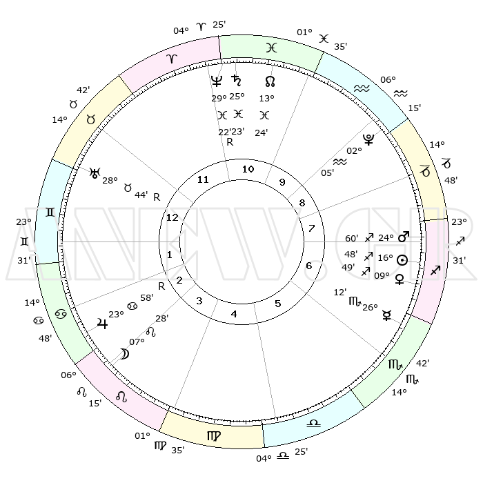 | | ΘΕΣΕΙΣ ΠΛΑΝΗΤΩΝ ΑΣΤΡΟΛΟΓΙΚΟΥ ΧΑΡΤΗ ΤΗΣ ΣΤΙΓΜΗΣ ΑΥΤΗΣ | | | | Πλανήτης | Ζώδιο | Μοίρες | Δεκαήμ. | Σε οίκο | Απόκλιση | | Ακμές των οίκων | | Ηλιος | Τοξότης | 17°03' | Δεύτερο | 4 | 22 S 48 | | 1ος | 07°04' | Παρθένος | | Σελήνη | Λέων | 10°53' | Δεύτερο | 12 | 20 N 05 | | 2ος | 01°39' | Ζυγός | | Ερμής | Σκορπιός | 26°28' | Τρίτο | 3 | 17 S 11 | | 3ος | 00°54' | Σκορπιός | | Αφροδίτη | Τοξότης | 10°08' | Δεύτερο | 4 | 21 S 34 | | 4ος | 03°51' | Τοξότης | | Αρης | Τοξότης | 25°11' | Τρίτο | 4 | 24 S 04 | | 5ος | 07°36' | Αιγόκερως | | Δίας | Καρκίνος | 23°56'R | Τρίτο | 11 | 21 N 29 | | 6ος | 09°03' | Υδροχόος | | Κρόνος | Ιχθείς | 25°23' | Τρίτο | 7 | 03 S 59 | | 7ος | 07°04' | Ιχθείς | | Ουρανός | Ταύρος | 28°44'R | Τρίτο | 9 | 19 N 40 | | 8ος | 01°39' | Κριός | | Ποσειδώνας | Ιχθείς | 29°22'R | Τρίτο | 7 | 01 S 29 | | 9ος | 00°54' | Ταύρος | | Πλούτωνας | Υδροχόος | 02°05' | Πρώτο | 5 | 23 S 21 | | 10ος | 03°51' | Δίδυμοι | | Β. Δεσμός | Ιχθείς | 13°24' | Δεύτερο | 7 | 06 S 32 | | 11ος | 07°36' | Καρκίνος | | Ωροσκόπος | Παρθένος | 07°04' | Πρώτο | | | 12ος | 09°03' | Λέων | | Μεσουράνημα | Δίδυμοι | 03°51' | Πρώτο | | | |