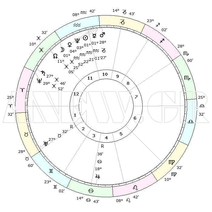 | | ΘΕΣΕΙΣ ΠΛΑΝΗΤΩΝ ΑΣΤΡΟΛΟΓΙΚΟΥ ΧΑΡΤΗ ΤΗΣ ΣΤΙΓΜΗΣ ΑΥΤΗΣ | | | | Πλανήτης | Ζώδιο | Μοίρες | Δεκαήμ. | Σε οίκο | Απόκλιση | | Ακμές των οίκων | | Ηλιος | Υδροχόος | 01°16' | Πρώτο | 11 | 19 S 52 | | 1ος | 14°50' | Ιχθείς | | Σελήνη | Ιχθείς | 00°30' | Πρώτο | 12 | 12 S 02 | | 2ος | 28°20' | Κριός | | Ερμής | Υδροχόος | 01°04' | Πρώτο | 11 | 21 S 55 | | 3ος | 28°15' | Ταύρος | | Αφροδίτη | Υδροχόος | 04°47' | Πρώτο | 11 | 20 S 11 | | 4ος | 21°25' | Δίδυμοι | | Αρης | Αιγόκερως | 28°24' | Τρίτο | 11 | 21 S 27 | | 5ος | 13°14' | Καρκίνος | | Δίας | Καρκίνος | 18°39'R | Δεύτερο | 5 | 22 N 25 | | 6ος | 08°30' | Λέων | | Κρόνος | Ιχθείς | 27°46' | Τρίτο | 1 | 02 S 54 | | 7ος | 14°50' | Παρθένος | | Ουρανός | Ταύρος | 27°32'R | Τρίτο | 2 | 19 N 25 | | 8ος | 28°20' | Ζυγός | | Ποσειδώνας | Ιχθείς | 29°52' | Τρίτο | 1 | 01 S 16 | | 9ος | 28°15' | Σκορπιός | | Πλούτωνας | Υδροχόος | 03°22' | Πρώτο | 11 | 23 S 05 | | 10ος | 21°25' | Τοξότης | | Β. Δεσμός | Ιχθείς | 11°06' | Δεύτερο | 12 | 07 S 24 | | 11ος | 13°14' | Αιγόκερως | | Ωροσκόπος | Ιχθείς | 14°50' | Δεύτερο | | | 12ος | 08°30' | Υδροχόος | | Μεσουράνημα | Τοξότης | 21°25' | Τρίτο | | | |