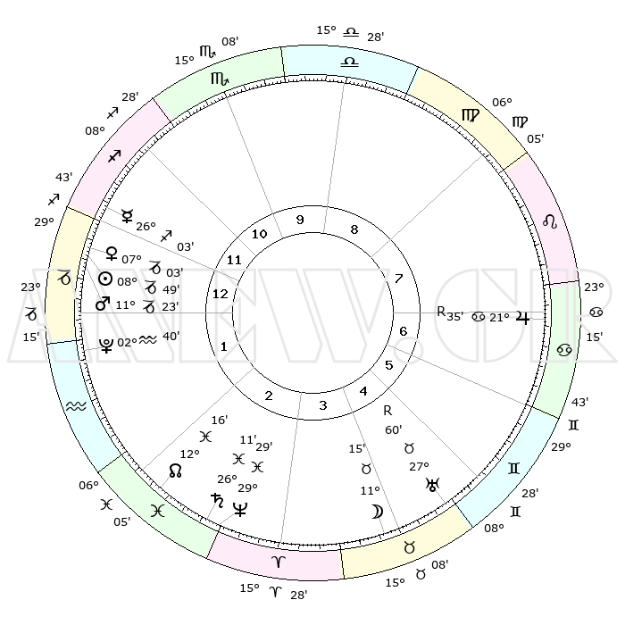 | | ΘΕΣΕΙΣ ΠΛΑΝΗΤΩΝ ΑΣΤΡΟΛΟΓΙΚΟΥ ΧΑΡΤΗ ΤΗΣ ΣΤΙΓΜΗΣ ΑΥΤΗΣ | | | | Πλανήτης | Ζώδιο | Μοίρες | Δεκαήμ. | Σε οίκο | Απόκλιση | | Ακμές των οίκων | | Ηλιος | Αιγόκερως | 08°45' | Πρώτο | 1 | 23 S 09 | | 1ος | 27°23' | Τοξότης | | Σελήνη | Ταύρος | 10°12' | Δεύτερο | 4 | 19 N 00 | | 2ος | 03°52' | Υδροχόος | | Ερμής | Τοξότης | 25°56' | Τρίτο | 12 | 23 S 44 | | 3ος | 13°40' | Ιχθείς | | Αφροδίτη | Αιγόκερως | 06°58' | Πρώτο | 1 | 23 S 41 | | 4ος | 18°00' | Κριός | | Αρης | Αιγόκερως | 11°19' | Δεύτερο | 1 | 23 S 50 | | 5ος | 14°45' | Ταύρος | | Δίας | Καρκίνος | 21°35'R | Τρίτο | 7 | 21 N 56 | | 6ος | 06°44' | Δίδυμοι | | Κρόνος | Ιχθείς | 26°11' | Τρίτο | 3 | 03 S 36 | | 7ος | 27°23' | Δίδυμοι | | Ουρανός | Ταύρος | 27°60'R | Τρίτο | 5 | 19 N 31 | | 8ος | 03°52' | Λέων | | Ποσειδώνας | Ιχθείς | 29°29' | Τρίτο | 3 | 01 S 26 | | 9ος | 13°40' | Παρθένος | | Πλούτωνας | Υδροχόος | 02°40' | Πρώτο | 1 | 23 S 14 | | 10ος | 18°00' | Ζυγός | | Β. Δεσμός | Ιχθείς | 12°16' | Δεύτερο | 2 | 06 S 57 | | 11ος | 14°45' | Σκορπιός | | Ωροσκόπος | Τοξότης | 27°23' | Τρίτο | | | 12ος | 06°44' | Τοξότης | | Μεσουράνημα | Ζυγός | 18°00' | Δεύτερο | | | |