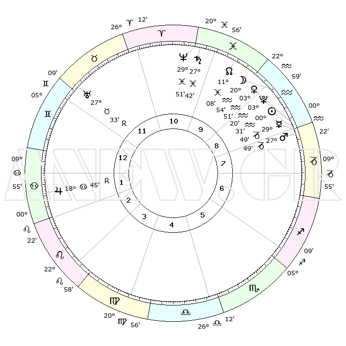 | | ΘΕΣΕΙΣ ΠΛΑΝΗΤΩΝ ΑΣΤΡΟΛΟΓΙΚΟΥ ΧΑΡΤΗ ΤΗΣ ΣΤΙΓΜΗΣ ΑΥΤΗΣ | | | | Πλανήτης | Ζώδιο | Μοίρες | Δεκαήμ. | Σε οίκο | Απόκλιση | | Ακμές των οίκων | | Ηλιος | Υδροχόος | 00°26' | Πρώτο | 9 | 20 S 03 | | 1ος | 09°13' | Δίδυμοι | | Σελήνη | Υδροχόος | 19°45' | Δεύτερο | 10 | 16 S 32 | | 2ος | 02°21' | Καρκίνος | | Ερμής | Αιγόκερως | 29°40' | Τρίτο | 9 | 22 S 12 | | 3ος | 23°34' | Καρκίνος | | Αφροδίτη | Υδροχόος | 03°44' | Πρώτο | 9 | 20 S 25 | | 4ος | 17°08' | Λέων | | Αρης | Αιγόκερως | 27°45' | Τρίτο | 9 | 21 S 35 | | 5ος | 17°16' | Παρθένος | | Δίας | Καρκίνος | 18°45'R | Δεύτερο | 2 | 22 N 24 | | 6ος | 26°55' | Ζυγός | | Κρόνος | Ιχθείς | 27°42' | Τρίτο | 11 | 02 S 56 | | 7ος | 09°13' | Τοξότης | | Ουρανός | Ταύρος | 27°33'R | Τρίτο | 12 | 19 N 25 | | 8ος | 02°21' | Αιγόκερως | | Ποσειδώνας | Ιχθείς | 29°51' | Τρίτο | 11 | 01 S 16 | | 9ος | 23°34' | Αιγόκερως | | Πλούτωνας | Υδροχόος | 03°20' | Πρώτο | 9 | 23 S 06 | | 10ος | 17°08' | Υδροχόος | | Β. Δεσμός | Ιχθείς | 11°08' | Δεύτερο | 10 | 07 S 23 | | 11ος | 17°16' | Ιχθείς | | Ωροσκόπος | Δίδυμοι | 09°13' | Πρώτο | | | 12ος | 26°55' | Κριός | | Μεσουράνημα | Υδροχόος | 17°08' | Δεύτερο | | | |