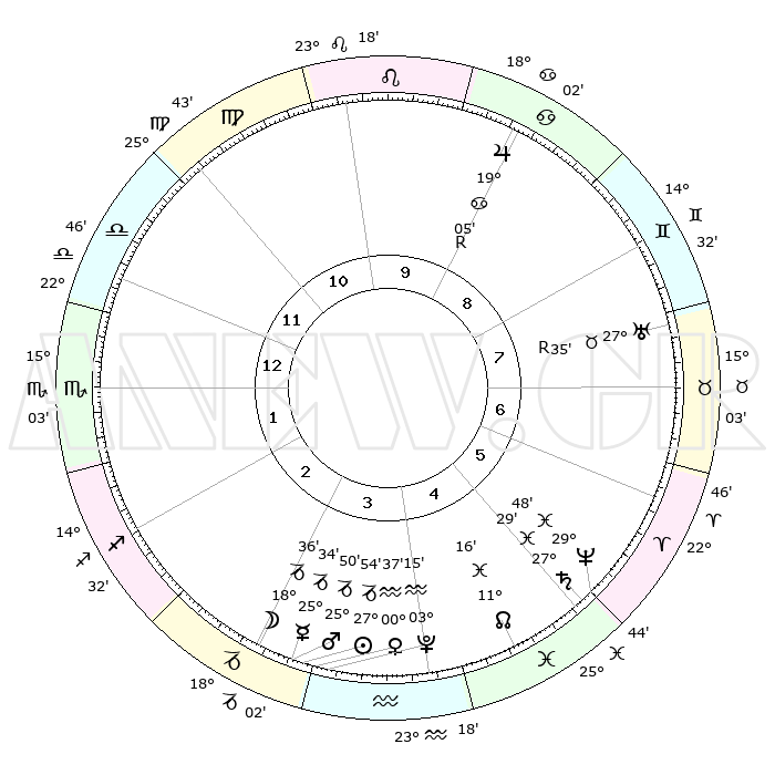 | | ΘΕΣΕΙΣ ΠΛΑΝΗΤΩΝ ΑΣΤΡΟΛΟΓΙΚΟΥ ΧΑΡΤΗ ΤΗΣ ΣΤΙΓΜΗΣ ΑΥΤΗΣ | | | | Πλανήτης | Ζώδιο | Μοίρες | Δεκαήμ. | Σε οίκο | Απόκλιση | | Ακμές των οίκων | | Ηλιος | Αιγόκερως | 27°50' | Τρίτο | 3 | 20 S 35 | | 1ος | 24°29' | Ζυγός | | Σελήνη | Αιγόκερως | 17°43' | Δεύτερο | 3 | 26 S 16 | | 2ος | 22°35' | Σκορπιός | | Ερμής | Αιγόκερως | 25°27' | Τρίτο | 3 | 22 S 57 | | 3ος | 24°08' | Τοξότης | | Αφροδίτη | Υδροχόος | 00°32' | Πρώτο | 4 | 21 S 04 | | 4ος | 27°59' | Αιγόκερως | | Αρης | Αιγόκερως | 25°46' | Τρίτο | 3 | 21 S 57 | | 5ος | 00°56' | Ιχθείς | | Δίας | Καρκίνος | 19°05'R | Δεύτερο | 9 | 22 N 21 | | 6ος | 00°04' | Κριός | | Κρόνος | Ιχθείς | 27°29' | Τρίτο | 5 | 03 S 02 | | 7ος | 24°29' | Κριός | | Ουρανός | Ταύρος | 27°35'R | Τρίτο | 8 | 19 N 26 | | 8ος | 22°35' | Ταύρος | | Ποσειδώνας | Ιχθείς | 29°48' | Τρίτο | 5 | 01 S 18 | | 9ος | 24°08' | Δίδυμοι | | Πλούτωνας | Υδροχόος | 03°15' | Πρώτο | 4 | 23 S 07 | | 10ος | 27°59' | Καρκίνος | | Β. Δεσμός | Ιχθείς | 11°16' | Δεύτερο | 5 | 07 S 20 | | 11ος | 00°56' | Παρθένος | | Ωροσκόπος | Ζυγός | 24°29' | Τρίτο | | | 12ος | 00°04' | Ζυγός | | Μεσουράνημα | Καρκίνος | 27°59' | Τρίτο | | | |