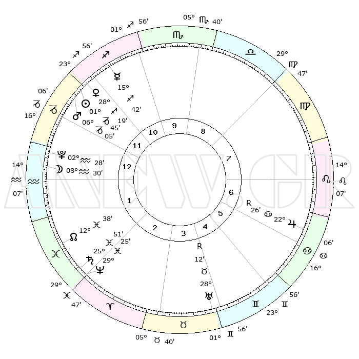 | | ΘΕΣΕΙΣ ΠΛΑΝΗΤΩΝ ΑΣΤΡΟΛΟΓΙΚΟΥ ΧΑΡΤΗ ΤΗΣ ΣΤΙΓΜΗΣ ΑΥΤΗΣ | | | | Πλανήτης | Ζώδιο | Μοίρες | Δεκαήμ. | Σε οίκο | Απόκλιση | | Ακμές των οίκων | | Ηλιος | Αιγόκερως | 01°40' | Πρώτο | 12 | 23 S 25 | | 1ος | 10°30' | Αιγόκερως | | Σελήνη | Υδροχόος | 07°29' | Πρώτο | 1 | 21 S 07 | | 2ος | 20°20' | Υδροχόος | | Ερμής | Τοξότης | 15°35' | Δεύτερο | 11 | 22 S 11 | | 3ος | 00°38' | Κριός | | Αφροδίτη | Τοξότης | 28°13' | Τρίτο | 12 | 23 S 35 | | 4ος | 02°43' | Ταύρος | | Αρης | Αιγόκερως | 06°02' | Πρώτο | 12 | 24 S 08 | | 5ος | 27°29' | Ταύρος | | Δίας | Καρκίνος | 22°27'R | Τρίτο | 7 | 21 N 47 | | 6ος | 18°48' | Δίδυμοι | | Κρόνος | Ιχθείς | 25°50' | Τρίτο | 2 | 03 S 45 | | 7ος | 10°30' | Καρκίνος | | Ουρανός | Ταύρος | 28°12'R | Τρίτο | 5 | 19 N 34 | | 8ος | 20°20' | Λέων | | Ποσειδώνας | Ιχθείς | 29°25' | Τρίτο | 2 | 01 S 27 | | 9ος | 00°38' | Ζυγός | | Πλούτωνας | Υδροχόος | 02°28' | Πρώτο | 1 | 23 S 16 | | 10ος | 02°43' | Σκορπιός | | Β. Δεσμός | Ιχθείς | 12°38' | Δεύτερο | 2 | 06 S 49 | | 11ος | 27°29' | Σκορπιός | | Ωροσκόπος | Αιγόκερως | 10°30' | Δεύτερο | | | 12ος | 18°48' | Τοξότης | | Μεσουράνημα | Σκορπιός | 02°43' | Πρώτο | | | |