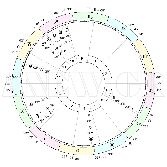 | | ΘΕΣΕΙΣ ΠΛΑΝΗΤΩΝ ΑΣΤΡΟΛΟΓΙΚΟΥ ΧΑΡΤΗ ΤΗΣ ΣΤΙΓΜΗΣ ΑΥΤΗΣ | | | | Πλανήτης | Ζώδιο | Μοίρες | Δεκαήμ. | Σε οίκο | Απόκλιση | | Ακμές των οίκων | | Ηλιος | Τοξότης | 26°22' | Τρίτο | 2 | 23 S 23 | | 1ος | 02°48' | Σκορπιός | | Σελήνη | Τοξότης | 04°17' | Πρώτο | 2 | 25 S 52 | | 2ος | 01°23' | Τοξότης | | Ερμής | Τοξότης | 08°07' | Πρώτο | 2 | 20 S 31 | | 3ος | 03°35' | Αιγόκερως | | Αφροδίτη | Τοξότης | 21°40' | Τρίτο | 2 | 23 S 08 | | 4ος | 07°58' | Υδροχόος | | Αρης | Αιγόκερως | 02°05' | Πρώτο | 2 | 24 S 13 | | 5ος | 10°50' | Ιχθείς | | Δίας | Καρκίνος | 23°03'R | Τρίτο | 9 | 21 N 40 | | 6ος | 09°15' | Κριός | | Κρόνος | Ιχθείς | 25°38' | Τρίτο | 5 | 03 S 51 | | 7ος | 02°48' | Ταύρος | | Ουρανός | Ταύρος | 28°23'R | Τρίτο | 7 | 19 N 36 | | 8ος | 01°23' | Δίδυμοι | | Ποσειδώνας | Ιχθείς | 29°23' | Τρίτο | 5 | 01 S 28 | | 9ος | 03°35' | Καρκίνος | | Πλούτωνας | Υδροχόος | 02°19' | Πρώτο | 3 | 23 S 18 | | 10ος | 07°58' | Λέων | | Β. Δεσμός | Ιχθείς | 12°54' | Δεύτερο | 5 | 06 S 43 | | 11ος | 10°50' | Παρθένος | | Ωροσκόπος | Σκορπιός | 02°48' | Πρώτο | | | 12ος | 09°15' | Ζυγός | | Μεσουράνημα | Λέων | 07°58' | Πρώτο | | | |