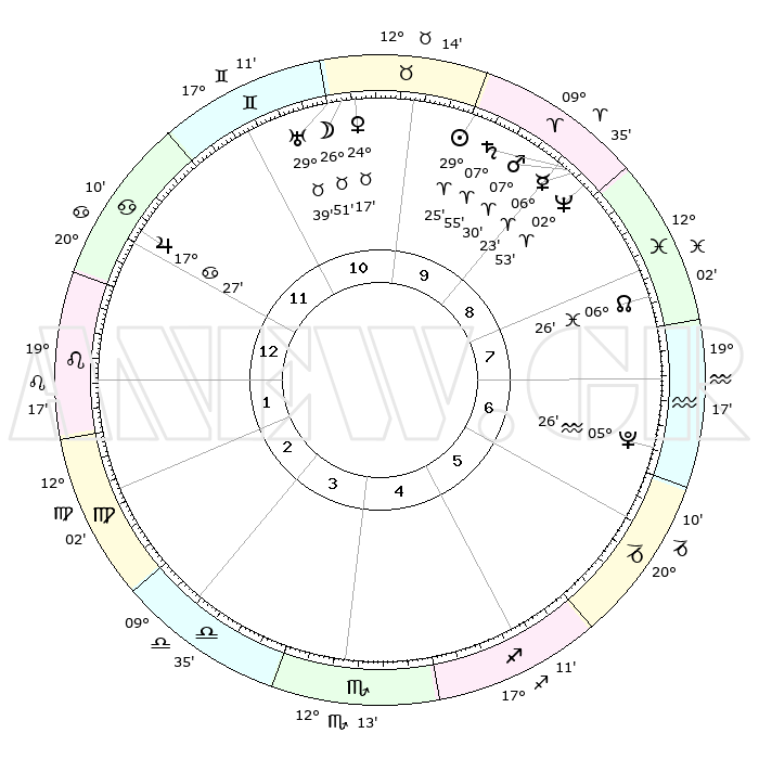 | | ΘΕΣΕΙΣ ΠΛΑΝΗΤΩΝ ΑΣΤΡΟΛΟΓΙΚΟΥ ΧΑΡΤΗ ΤΗΣ ΣΤΙΓΜΗΣ ΑΥΤΗΣ | | | | Πλανήτης | Ζώδιο | Μοίρες | Δεκαήμ. | Σε οίκο | Απόκλιση | | Ακμές των οίκων | | Ηλιος | Κριός | 29°21' | Τρίτο | 10 | 11 N 14 | | 1ος | 29°20' | Καρκίνος | | Σελήνη | Ταύρος | 25°49' | Τρίτο | 11 | 24 N 03 | | 2ος | 20°20' | Λέων | | Ερμής | Κριός | 06°16' | Πρώτο | 9 | 00 N 05 | | 3ος | 15°18' | Παρθένος | | Αφροδίτη | Ταύρος | 24°12' | Τρίτο | 11 | 19 N 11 | | 4ος | 16°15' | Ζυγός | | Αρης | Κριός | 07°27' | Πρώτο | 9 | 02 N 04 | | 5ος | 22°18' | Σκορπιός | | Δίας | Καρκίνος | 17°27' | Δεύτερο | 12 | 22 N 41 | | 6ος | 28°07' | Τοξότης | | Κρόνος | Κριός | 07°55' | Πρώτο | 9 | 01 N 10 | | 7ος | 29°20' | Αιγόκερως | | Ουρανός | Ταύρος | 29°39' | Τρίτο | 11 | 19 N 54 | | 8ος | 20°20' | Υδροχόος | | Ποσειδώνας | Κριός | 02°53' | Πρώτο | 9 | 00 S 04 | | 9ος | 15°18' | Ιχθείς | | Πλούτωνας | Υδροχόος | 05°26' | Πρώτο | 7 | 22 S 48 | | 10ος | 16°15' | Κριός | | Β. Δεσμός | Ιχθείς | 06°26' | Πρώτο | 8 | 09 S 09 | | 11ος | 22°18' | Ταύρος | | Ωροσκόπος | Καρκίνος | 29°20' | Τρίτο | | | 12ος | 28°07' | Δίδυμοι | | Μεσουράνημα | Κριός | 16°15' | Δεύτερο | | | |