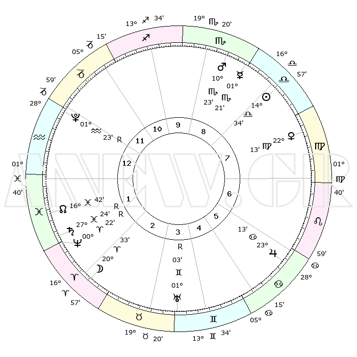 | ΘΕΣΕΙΣ ΠΛΑΝΗΤΩΝ ΑΣΤΡΟΛΟΓΙΚΟΥ ΧΑΡΤΗ ΤΗΣ ΣΤΙΓΜΗΣ ΑΥΤΗΣ | | Πλανήτης | Ζώδιο | Μοίρες | Δεκαήμ. | Σε οίκο | Απόκλιση | | Ακμές των οίκων | Ηλιος | Ζυγός | 14°29' | Δεύτερο | 8 | 05 S 43 | | 1ος | 24°51' | Αιγόκερως | Σελήνη | Κριός | 19°23' | Δεύτερο | 3 | 10 N 05 | | 2ος | 08°01' | Ιχθείς | Ερμής | Σκορπιός | 01°14' | Πρώτο | 9 | 12 S 44 | | 3ος | 17°12' | Κριός | Αφροδίτη | Παρθένος | 22°07' | Τρίτο | 8 | 04 N 26 | | 4ος | 16°35' | Ταύρος | Αρης | Σκορπιός | 10°20' | Δεύτερο | 9 | 15 S 03 | | 5ος | 09°45' | Δίδυμοι | Δίας | Καρκίνος | 23°13' | Τρίτο | 6 | 21 N 28 | | 6ος | 01°02' | Καρκίνος | Κρόνος | Ιχθείς | 27°24'R | Τρίτο | 2 | 03 S 20 | | 7ος | 24°51' | Καρκίνος | Ουρανός | Δίδυμοι | 01°04'R | Πρώτο | 4 | 20 N 10 | | 8ος | 08°01' | Παρθένος | Ποσειδώνας | Κριός | 00°22'R | Πρώτο | 2 | 01 S 07 | | 9ος | 17°12' | Ζυγός | Πλούτωνας | Υδροχόος | 01°23'R | Πρώτο | 1 | 23 S 32 | | 10ος | 16°35' | Σκορπιός | Β. Δεσμός | Ιχθείς | 16°42' | Δεύτερο | 2 | 05 S 15 | | 11ος | 09°45' | Τοξότης | Ωροσκόπος | Αιγόκερως | 24°51' | Τρίτο | | | 12ος | 01°02' | Αιγόκερως | Μεσουράνημα | Σκορπιός | 16°35' | Δεύτερο | | | |