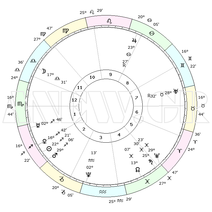 | | ΘΕΣΕΙΣ ΠΛΑΝΗΤΩΝ ΑΣΤΡΟΛΟΓΙΚΟΥ ΧΑΡΤΗ ΤΗΣ ΣΤΙΓΜΗΣ ΑΥΤΗΣ | | | | Πλανήτης | Ζώδιο | Μοίρες | Δεκαήμ. | Σε οίκο | Απόκλιση | | Ακμές των οίκων | | Ηλιος | Τοξότης | 22°13' | Τρίτο | 3 | 23 S 12 | | 1ος | 04°59' | Ζυγός | | Σελήνη | Ζυγός | 15°48' | Δεύτερο | 1 | 08 S 44 | | 2ος | 01°55' | Σκορπιός | | Ερμής | Τοξότης | 02°35' | Πρώτο | 3 | 19 S 02 | | 3ος | 02°33' | Τοξότης | | Αφροδίτη | Τοξότης | 16°31' | Δεύτερο | 3 | 22 S 33 | | 4ος | 05°36' | Αιγόκερως | | Αρης | Τοξότης | 28°60' | Τρίτο | 3 | 24 S 12 | | 5ος | 08°32' | Υδροχόος | | Δίας | Καρκίνος | 23°28'R | Τρίτο | 10 | 21 N 35 | | 6ος | 08°46' | Ιχθείς | | Κρόνος | Ιχθείς | 25°30' | Τρίτο | 6 | 03 S 55 | | 7ος | 04°59' | Κριός | | Ουρανός | Ταύρος | 28°32'R | Τρίτο | 8 | 19 N 38 | | 8ος | 01°55' | Ταύρος | | Ποσειδώνας | Ιχθείς | 29°23' | Τρίτο | 6 | 01 S 29 | | 9ος | 02°33' | Δίδυμοι | | Πλούτωνας | Υδροχόος | 02°13' | Πρώτο | 4 | 23 S 20 | | 10ος | 05°36' | Καρκίνος | | Β. Δεσμός | Ιχθείς | 13°07' | Δεύτερο | 6 | 06 S 38 | | 11ος | 08°32' | Λέων | | Ωροσκόπος | Ζυγός | 04°59' | Πρώτο | | | 12ος | 08°47' | Παρθένος | | Μεσουράνημα | Καρκίνος | 05°36' | Πρώτο | | | |