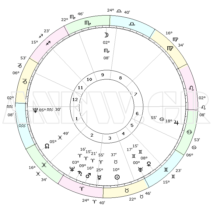 | | ΘΕΣΕΙΣ ΠΛΑΝΗΤΩΝ ΑΣΤΡΟΛΟΓΙΚΟΥ ΧΑΡΤΗ ΤΗΣ ΣΤΙΓΜΗΣ ΑΥΤΗΣ | | | | Πλανήτης | Ζώδιο | Μοίρες | Δεκαήμ. | Σε οίκο | Απόκλιση | | Ακμές των οίκων | | Ηλιος | Ταύρος | 10°34' | Δεύτερο | 4 | 14 N 59 | | 1ος | 13°35' | Αιγόκερως | | Σελήνη | Σκορπιός | 01°34' | Πρώτο | 9 | 15 S 52 | | 2ος | 24°11' | Υδροχόος | | Ερμής | Κριός | 25°50' | Τρίτο | 3 | 08 N 11 | | 3ος | 04°23' | Κριός | | Αφροδίτη | Δίδυμοι | 08°12' | Πρώτο | 5 | 22 N 33 | | 4ος | 05°53' | Ταύρος | | Αρης | Κριός | 16°19' | Δεύτερο | 3 | 05 N 36 | | 5ος | 00°15' | Δίδυμοι | | Δίας | Καρκίνος | 18°54' | Δεύτερο | 7 | 22 N 29 | | 6ος | 21°30' | Δίδυμοι | | Κρόνος | Κριός | 09°15' | Πρώτο | 3 | 01 N 40 | | 7ος | 13°35' | Καρκίνος | | Ουρανός | Δίδυμοι | 00°16' | Πρώτο | 5 | 20 N 03 | | 8ος | 24°11' | Λέων | | Ποσειδώνας | Κριός | 03°16' | Πρώτο | 2 | 00 N 05 | | 9ος | 04°23' | Ζυγός | | Πλούτωνας | Υδροχόος | 05°30' | Πρώτο | 1 | 22 S 49 | | 10ος | 05°53' | Σκορπιός | | Β. Δεσμός | Ιχθείς | 05°49' | Πρώτο | 2 | 09 S 23 | | 11ος | 00°15' | Τοξότης | | Ωροσκόπος | Αιγόκερως | 13°35' | Δεύτερο | | | 12ος | 21°30' | Τοξότης | | Μεσουράνημα | Σκορπιός | 05°53' | Πρώτο | | | |