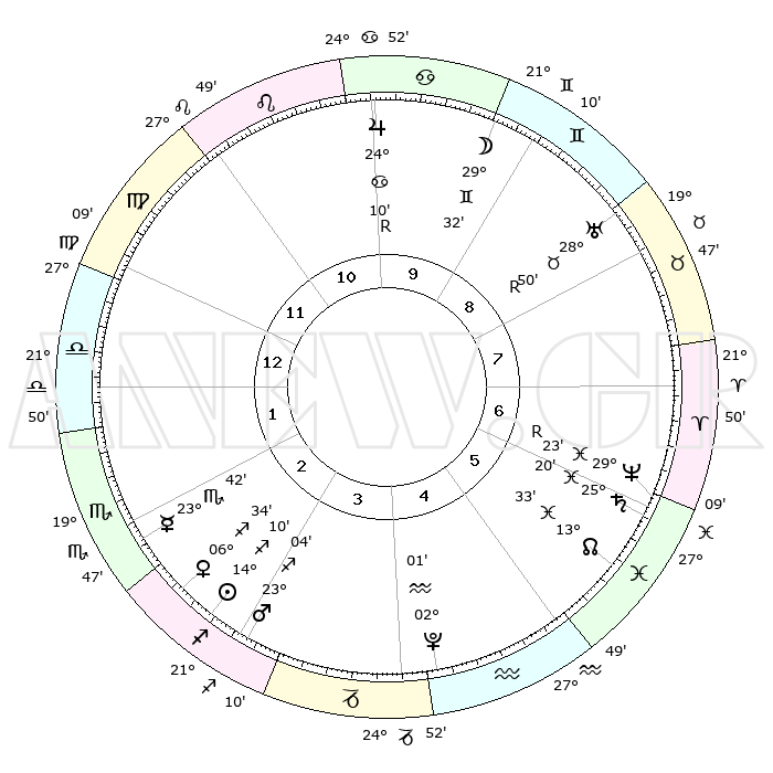 | | ΘΕΣΕΙΣ ΠΛΑΝΗΤΩΝ ΑΣΤΡΟΛΟΓΙΚΟΥ ΧΑΡΤΗ ΤΗΣ ΣΤΙΓΜΗΣ ΑΥΤΗΣ | | | | Πλανήτης | Ζώδιο | Μοίρες | Δεκαήμ. | Σε οίκο | Απόκλιση | | Ακμές των οίκων | | Ηλιος | Τοξότης | 14°08' | Δεύτερο | 3 | 22 S 29 | | 1ος | 11°39' | Ζυγός | | Σελήνη | Δίδυμοι | 29°00' | Τρίτο | 9 | 28 N 15 | | 2ος | 08°60' | Σκορπιός | | Ερμής | Σκορπιός | 23°41' | Τρίτο | 2 | 16 S 17 | | 3ος | 09°53' | Τοξότης | | Αφροδίτη | Τοξότης | 06°31' | Πρώτο | 2 | 20 S 53 | | 4ος | 13°08' | Αιγόκερως | | Αρης | Τοξότης | 23°02' | Τρίτο | 3 | 23 S 57 | | 5ος | 16°03' | Υδροχόος | | Δίας | Καρκίνος | 24°11'R | Τρίτο | 10 | 21 N 26 | | 6ος | 15°59' | Ιχθείς | | Κρόνος | Ιχθείς | 25°20' | Τρίτο | 6 | 04 S 01 | | 7ος | 11°39' | Κριός | | Ουρανός | Ταύρος | 28°51'R | Τρίτο | 8 | 19 N 42 | | 8ος | 08°60' | Ταύρος | | Ποσειδώνας | Ιχθείς | 29°23'R | Τρίτο | 6 | 01 S 29 | | 9ος | 09°53' | Δίδυμοι | | Πλούτωνας | Υδροχόος | 02°01' | Πρώτο | 4 | 23 S 22 | | 10ος | 13°08' | Καρκίνος | | Β. Δεσμός | Ιχθείς | 13°33' | Δεύτερο | 5 | 06 S 28 | | 11ος | 16°03' | Λέων | | Ωροσκόπος | Ζυγός | 11°39' | Δεύτερο | | | 12ος | 15°59' | Παρθένος | | Μεσουράνημα | Καρκίνος | 13°08' | Δεύτερο | | | |
