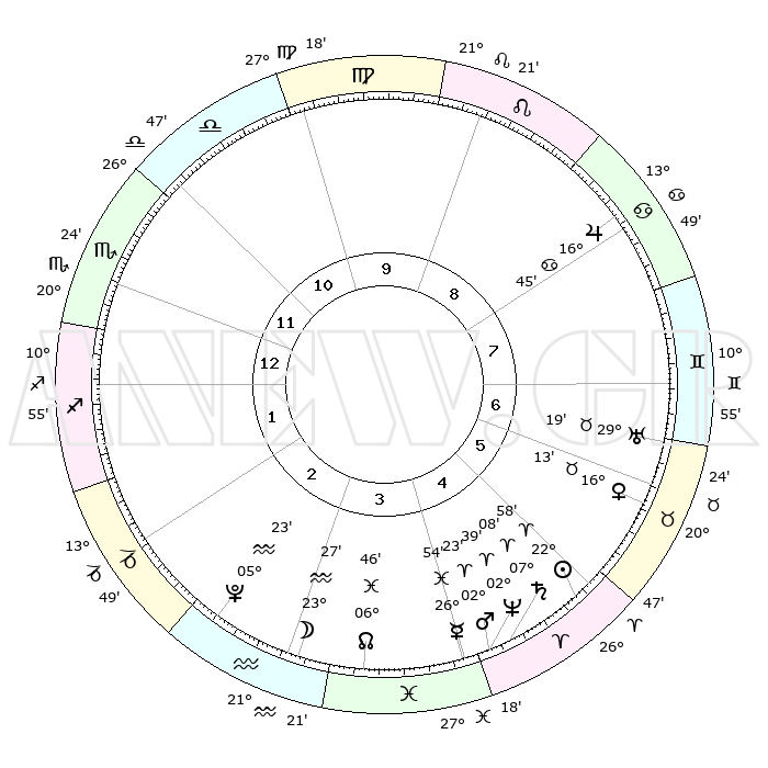 | | ΘΕΣΕΙΣ ΠΛΑΝΗΤΩΝ ΑΣΤΡΟΛΟΓΙΚΟΥ ΧΑΡΤΗ ΤΗΣ ΣΤΙΓΜΗΣ ΑΥΤΗΣ | | | | Πλανήτης | Ζώδιο | Μοίρες | Δεκαήμ. | Σε οίκο | Απόκλιση | | Ακμές των οίκων | | Ηλιος | Κριός | 22°53' | Τρίτο | 5 | 08 N 54 | | 1ος | 18°43' | Σκορπιός | | Σελήνη | Υδροχόος | 22°29' | Τρίτο | 3 | 15 S 20 | | 2ος | 18°32' | Τοξότης | | Ερμής | Ιχθείς | 26°48' | Τρίτο | 4 | 03 S 34 | | 3ος | 22°30' | Αιγόκερως | | Αφροδίτη | Ταύρος | 16°08' | Δεύτερο | 6 | 16 N 44 | | 4ος | 28°02' | Υδροχόος | | Αρης | Κριός | 02°20' | Πρώτο | 5 | 00 N 01 | | 5ος | 00°12' | Κριός | | Δίας | Καρκίνος | 16°45' | Δεύτερο | 8 | 22 N 46 | | 6ος | 26°46' | Κριός | | Κρόνος | Κριός | 07°07' | Πρώτο | 5 | 00 N 51 | | 7ος | 18°43' | Ταύρος | | Ουρανός | Ταύρος | 29°19' | Τρίτο | 7 | 19 N 50 | | 8ος | 18°32' | Δίδυμοι | | Ποσειδώνας | Κριός | 02°39' | Πρώτο | 5 | 00 S 09 | | 9ος | 22°30' | Καρκίνος | | Πλούτωνας | Υδροχόος | 05°23' | Πρώτο | 3 | 22 S 47 | | 10ος | 28°02' | Λέων | | Β. Δεσμός | Ιχθείς | 06°47' | Πρώτο | 4 | 09 S 01 | | 11ος | 00°12' | Ζυγός | | Ωροσκόπος | Σκορπιός | 18°43' | Δεύτερο | | | 12ος | 26°46' | Ζυγός | | Μεσουράνημα | Λέων | 28°02' | Τρίτο | | | |