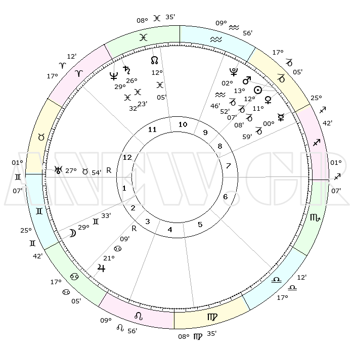 | | ΘΕΣΕΙΣ ΠΛΑΝΗΤΩΝ ΑΣΤΡΟΛΟΓΙΚΟΥ ΧΑΡΤΗ ΤΗΣ ΣΤΙΓΜΗΣ ΑΥΤΗΣ | | | | Πλανήτης | Ζώδιο | Μοίρες | Δεκαήμ. | Σε οίκο | Απόκλιση | | Ακμές των οίκων | | Ηλιος | Αιγόκερως | 12°02' | Δεύτερο | 9 | 22 S 53 | | 1ος | 24°30' | Κριός | | Σελήνη | Δίδυμοι | 28°26' | Τρίτο | 3 | 28 N 15 | | 2ος | 28°15' | Ταύρος | | Ερμής | Αιγόκερως | 00°52' | Πρώτο | 9 | 24 S 09 | | 3ος | 22°24' | Δίδυμοι | | Αφροδίτη | Αιγόκερως | 11°02' | Δεύτερο | 9 | 23 S 32 | | 4ος | 14°05' | Καρκίνος | | Αρης | Αιγόκερως | 13°48' | Δεύτερο | 9 | 23 S 37 | | 5ος | 07°58' | Λέων | | Δίας | Καρκίνος | 21°10'R | Τρίτο | 4 | 22 N 00 | | 6ος | 09°37' | Παρθένος | | Κρόνος | Ιχθείς | 26°22' | Τρίτο | 12 | 03 S 31 | | 7ος | 24°30' | Ζυγός | | Ουρανός | Ταύρος | 27°54'R | Τρίτο | 1 | 19 N 30 | | 8ος | 28°15' | Σκορπιός | | Ποσειδώνας | Ιχθείς | 29°32' | Τρίτο | 12 | 01 S 25 | | 9ος | 22°24' | Τοξότης | | Πλούτωνας | Υδροχόος | 02°46' | Πρώτο | 10 | 23 S 13 | | 10ος | 14°05' | Αιγόκερως | | Β. Δεσμός | Ιχθείς | 12°06' | Δεύτερο | 12 | 07 S 01 | | 11ος | 07°58' | Υδροχόος | | Ωροσκόπος | Κριός | 24°30' | Τρίτο | | | 12ος | 09°37' | Ιχθείς | | Μεσουράνημα | Αιγόκερως | 14°05' | Δεύτερο | | | |