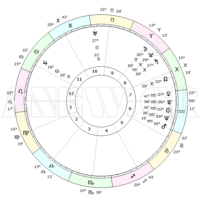 | | ΘΕΣΕΙΣ ΠΛΑΝΗΤΩΝ ΑΣΤΡΟΛΟΓΙΚΟΥ ΧΑΡΤΗ ΤΗΣ ΣΤΙΓΜΗΣ ΑΥΤΗΣ | | | | Πλανήτης | Ζώδιο | Μοίρες | Δεκαήμ. | Σε οίκο | Απόκλιση | | Ακμές των οίκων | | Ηλιος | Υδροχόος | 03°39' | Πρώτο | 6 | 19 S 20 | | 1ος | 04°23' | Λέων | | Σελήνη | Κριός | 01°14' | Πρώτο | 9 | 02 N 16 | | 2ος | 25°44' | Λέων | | Ερμής | Υδροχόος | 04°60' | Πρώτο | 7 | 21 S 02 | | 3ος | 21°23' | Παρθένος | | Αφροδίτη | Υδροχόος | 07°42' | Πρώτο | 7 | 19 S 30 | | 4ος | 22°55' | Ζυγός | | Αρης | Υδροχόος | 00°13' | Πρώτο | 6 | 21 S 05 | | 5ος | 28°49' | Σκορπιός | | Δίας | Καρκίνος | 18°21'R | Δεύτερο | 12 | 22 N 28 | | 6ος | 03°49' | Αιγόκερως | | Κρόνος | Ιχθείς | 27°58' | Τρίτο | 9 | 02 S 49 | | 7ος | 04°23' | Υδροχόος | | Ουρανός | Ταύρος | 27°31'R | Τρίτο | 10 | 19 N 25 | | 8ος | 25°44' | Υδροχόος | | Ποσειδώνας | Ιχθείς | 29°56' | Τρίτο | 9 | 01 S 14 | | 9ος | 21°23' | Ιχθείς | | Πλούτωνας | Υδροχόος | 03°26' | Πρώτο | 6 | 23 S 04 | | 10ος | 22°55' | Κριός | | Β. Δεσμός | Ιχθείς | 10°58' | Δεύτερο | 8 | 07 S 27 | | 11ος | 28°49' | Ταύρος | | Ωροσκόπος | Λέων | 04°23' | Πρώτο | | | 12ος | 03°49' | Καρκίνος | | Μεσουράνημα | Κριός | 22°55' | Τρίτο | | | |