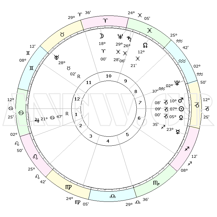 | | ΘΕΣΕΙΣ ΠΛΑΝΗΤΩΝ ΑΣΤΡΟΛΟΓΙΚΟΥ ΧΑΡΤΗ ΤΗΣ ΣΤΙΓΜΗΣ ΑΥΤΗΣ | | | | Πλανήτης | Ζώδιο | Μοίρες | Δεκαήμ. | Σε οίκο | Απόκλιση | | Ακμές των οίκων | | Ηλιος | Αιγόκερως | 07°05' | Πρώτο | 7 | 23 S 15 | | 1ος | 18°00' | Δίδυμοι | | Σελήνη | Κριός | 16°59' | Δεύτερο | 11 | 09 N 25 | | 2ος | 09°53' | Καρκίνος | | Ερμής | Τοξότης | 23°28' | Τρίτο | 7 | 23 S 27 | | 3ος | 01°10' | Λέων | | Αφροδίτη | Αιγόκερως | 04°54' | Πρώτο | 7 | 23 S 43 | | 4ος | 25°44' | Λέων | | Αρης | Αιγόκερως | 10°05' | Δεύτερο | 8 | 23 S 55 | | 5ος | 27°33' | Παρθένος | | Δίας | Καρκίνος | 21°48'R | Τρίτο | 2 | 21 N 54 | | 6ος | 07°47' | Σκορπιός | | Κρόνος | Ιχθείς | 26°06' | Τρίτο | 10 | 03 S 38 | | 7ος | 18°00' | Τοξότης | | Ουρανός | Ταύρος | 28°03'R | Τρίτο | 12 | 19 N 31 | | 8ος | 09°53' | Αιγόκερως | | Ποσειδώνας | Ιχθείς | 29°28' | Τρίτο | 11 | 01 S 26 | | 9ος | 01°10' | Υδροχόος | | Πλούτωνας | Υδροχόος | 02°37' | Πρώτο | 9 | 23 S 14 | | 10ος | 25°44' | Υδροχόος | | Β. Δεσμός | Ιχθείς | 12°21' | Δεύτερο | 10 | 06 S 56 | | 11ος | 27°33' | Ιχθείς | | Ωροσκόπος | Δίδυμοι | 18°00' | Δεύτερο | | | 12ος | 07°47' | Ταύρος | | Μεσουράνημα | Υδροχόος | 25°44' | Τρίτο | | | |