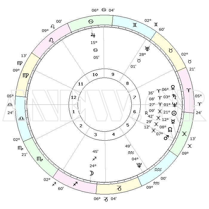 | | ΘΕΣΕΙΣ ΠΛΑΝΗΤΩΝ ΑΣΤΡΟΛΟΓΙΚΟΥ ΧΑΡΤΗ ΤΗΣ ΣΤΙΓΜΗΣ ΑΥΤΗΣ | | | | Πλανήτης | Ζώδιο | Μοίρες | Δεκαήμ. | Σε οίκο | Απόκλιση | | Ακμές των οίκων | | Ηλιος | Ιχθείς | 21°06' | Τρίτο | 7 | 03 S 32 | | 1ος | 18°12' | Παρθένος | | Σελήνη | Τοξότης | 24°04' | Τρίτο | 4 | 28 S 23 | | 2ος | 13°50' | Ζυγός | | Ερμής | Ιχθείς | 12°45'R | Δεύτερο | 6 | 03 S 54 | | 3ος | 13°46' | Σκορπιός | | Αφροδίτη | Κριός | 06°30' | Πρώτο | 7 | 01 N 32 | | 4ος | 16°42' | Τοξότης | | Αρης | Ιχθείς | 07°10' | Πρώτο | 6 | 09 S 53 | | 5ος | 19°56' | Αιγόκερως | | Δίας | Καρκίνος | 15°05' | Δεύτερο | 10 | 22 N 56 | | 6ος | 20°50' | Υδροχόος | | Κρόνος | Κριός | 03°08' | Πρώτο | 7 | 00 S 42 | | 7ος | 18°12' | Ιχθείς | | Ουρανός | Ταύρος | 28°01' | Τρίτο | 9 | 19 N 32 | | 8ος | 13°50' | Κριός | | Ποσειδώνας | Κριός | 01°27' | Πρώτο | 7 | 00 S 38 | | 9ος | 13°46' | Ταύρος | | Πλούτωνας | Υδροχόος | 04°48' | Πρώτο | 5 | 22 S 50 | | 10ος | 16°42' | Δίδυμοι | | Β. Δεσμός | Ιχθείς | 08°29' | Πρώτο | 6 | 08 S 23 | | 11ος | 19°56' | Καρκίνος | | Ωροσκόπος | Παρθένος | 18°12' | Δεύτερο | | | 12ος | 20°50' | Λέων | | Μεσουράνημα | Δίδυμοι | 16°42' | Δεύτερο | | | |
