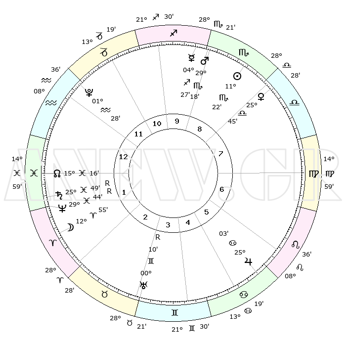 | | ΘΕΣΕΙΣ ΠΛΑΝΗΤΩΝ ΑΣΤΡΟΛΟΓΙΚΟΥ ΧΑΡΤΗ ΤΗΣ ΣΤΙΓΜΗΣ ΑΥΤΗΣ | | | | Πλανήτης | Ζώδιο | Μοίρες | Δεκαήμ. | Σε οίκο | Απόκλιση | | Ακμές των οίκων | | Ηλιος | Σκορπιός | 11°04' | Δεύτερο | 12 | 15 S 09 | | 1ος | 23°08' | Σκορπιός | | Σελήνη | Κριός | 08°38' | Πρώτο | 5 | 05 N 09 | | 2ος | 23°25' | Τοξότης | | Ερμής | Τοξότης | 04°14' | Πρώτο | 1 | 23 S 49 | | 3ος | 28°02' | Αιγόκερως | | Αφροδίτη | Ζυγός | 25°23' | Τρίτο | 11 | 08 S 28 | | 4ος | 03°49' | Ιχθείς | | Αρης | Σκορπιός | 29°05' | Τρίτο | 1 | 20 S 21 | | 5ος | 05°36' | Κριός | | Δίας | Καρκίνος | 25°02' | Τρίτο | 8 | 21 N 12 | | 6ος | 01°35' | Ταύρος | | Κρόνος | Ιχθείς | 25°49'R | Τρίτο | 4 | 03 S 55 | | 7ος | 23°08' | Ταύρος | | Ουρανός | Δίδυμοι | 00°11'R | Πρώτο | 7 | 19 N 59 | | 8ος | 23°25' | Δίδυμοι | | Ποσειδώνας | Ιχθείς | 29°45'R | Τρίτο | 4 | 01 S 21 | | 9ος | 28°02' | Καρκίνος | | Πλούτωνας | Υδροχόος | 01°28' | Πρώτο | 3 | 23 S 30 | | 10ος | 03°49' | Παρθένος | | Β. Δεσμός | Ιχθείς | 15°17' | Δεύτερο | 4 | 05 S 48 | | 11ος | 05°36' | Ζυγός | | Ωροσκόπος | Σκορπιός | 23°08' | Τρίτο | | | 12ος | 01°35' | Σκορπιός | | Μεσουράνημα | Παρθένος | 03°49' | Πρώτο | | | |