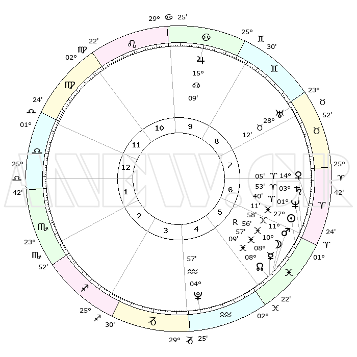 | | ΘΕΣΕΙΣ ΠΛΑΝΗΤΩΝ ΑΣΤΡΟΛΟΓΙΚΟΥ ΧΑΡΤΗ ΤΗΣ ΣΤΙΓΜΗΣ ΑΥΤΗΣ | | | | Πλανήτης | Ζώδιο | Μοίρες | Δεκαήμ. | Σε οίκο | Απόκλιση | | Ακμές των οίκων | | Ηλιος | Ιχθείς | 27°08' | Τρίτο | 6 | 01 S 08 | | 1ος | 07°09' | Ζυγός | | Σελήνη | Ιχθείς | 10°05' | Δεύτερο | 5 | 07 S 42 | | 2ος | 04°14' | Σκορπιός | | Ερμής | Ιχθείς | 08°59'R | Πρώτο | 5 | 06 S 35 | | 3ος | 04°56' | Τοξότης | | Αφροδίτη | Κριός | 14°01' | Δεύτερο | 7 | 04 N 38 | | 4ος | 08°03' | Αιγόκερως | | Αρης | Ιχθείς | 11°55' | Δεύτερο | 6 | 08 S 05 | | 5ος | 10°59' | Υδροχόος | | Δίας | Καρκίνος | 15°09' | Δεύτερο | 10 | 22 N 56 | | 6ος | 11°07' | Ιχθείς | | Κρόνος | Κριός | 03°53' | Πρώτο | 6 | 00 S 24 | | 7ος | 07°09' | Κριός | | Ουρανός | Ταύρος | 28°12' | Τρίτο | 8 | 19 N 35 | | 8ος | 04°14' | Ταύρος | | Ποσειδώνας | Κριός | 01°40' | Πρώτο | 6 | 00 S 32 | | 9ος | 04°56' | Δίδυμοι | | Πλούτωνας | Υδροχόος | 04°57' | Πρώτο | 4 | 22 S 49 | | 10ος | 08°03' | Καρκίνος | | Β. Δεσμός | Ιχθείς | 08°10' | Πρώτο | 5 | 08 S 30 | | 11ος | 10°59' | Λέων | | Ωροσκόπος | Ζυγός | 07°09' | Πρώτο | | | 12ος | 11°07' | Παρθένος | | Μεσουράνημα | Καρκίνος | 08°03' | Πρώτο | | | |
