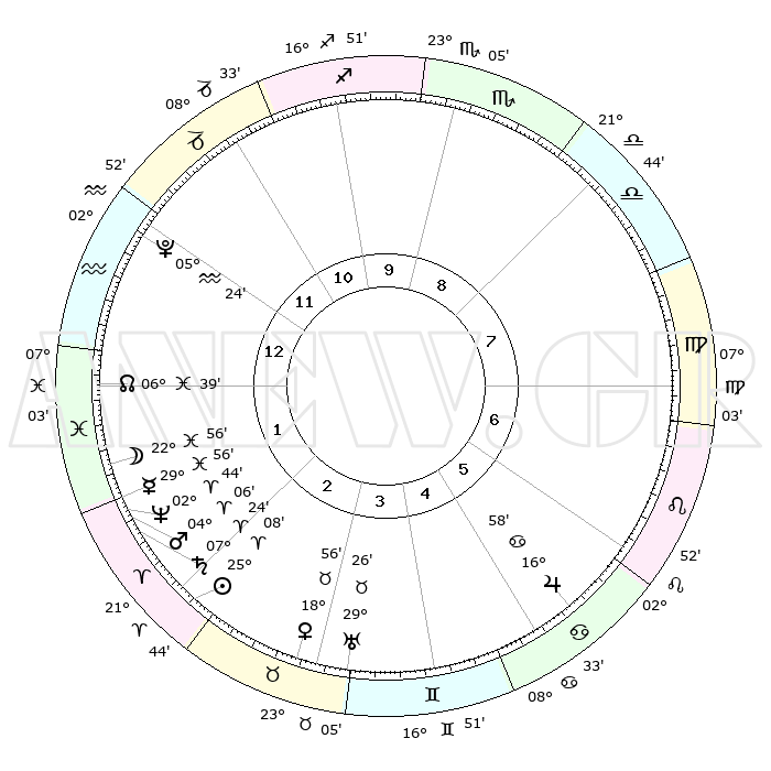 | | ΘΕΣΕΙΣ ΠΛΑΝΗΤΩΝ ΑΣΤΡΟΛΟΓΙΚΟΥ ΧΑΡΤΗ ΤΗΣ ΣΤΙΓΜΗΣ ΑΥΤΗΣ | | | | Πλανήτης | Ζώδιο | Μοίρες | Δεκαήμ. | Σε οίκο | Απόκλιση | | Ακμές των οίκων | | Ηλιος | Κριός | 25°04' | Τρίτο | 2 | 09 N 42 | | 1ος | 08°59' | Υδροχόος | | Σελήνη | Ιχθείς | 22°11' | Τρίτο | 1 | 01 S 57 | | 2ος | 24°16' | Ιχθείς | | Ερμής | Ιχθείς | 29°51' | Τρίτο | 2 | 02 S 26 | | 3ος | 01°09' | Ταύρος | | Αφροδίτη | Ταύρος | 18°52' | Δεύτερο | 3 | 17 N 36 | | 4ος | 28°09' | Ταύρος | | Αρης | Κριός | 04°04' | Πρώτο | 2 | 00 N 43 | | 5ος | 20°22' | Δίδυμοι | | Δίας | Καρκίνος | 16°58' | Δεύτερο | 6 | 22 N 44 | | 6ος | 12°13' | Καρκίνος | | Κρόνος | Κριός | 07°23' | Πρώτο | 2 | 00 N 58 | | 7ος | 08°59' | Λέων | | Ουρανός | Ταύρος | 29°25' | Τρίτο | 4 | 19 N 51 | | 8ος | 24°16' | Παρθένος | | Ποσειδώνας | Κριός | 02°44' | Πρώτο | 2 | 00 S 07 | | 9ος | 01°09' | Σκορπιός | | Πλούτωνας | Υδροχόος | 05°24' | Πρώτο | 12 | 22 S 47 | | 10ος | 28°09' | Σκορπιός | | Β. Δεσμός | Ιχθείς | 06°40' | Πρώτο | 1 | 09 S 04 | | 11ος | 20°22' | Τοξότης | | Ωροσκόπος | Υδροχόος | 08°59' | Πρώτο | | | 12ος | 12°13' | Αιγόκερως | | Μεσουράνημα | Σκορπιός | 28°09' | Τρίτο | | | |