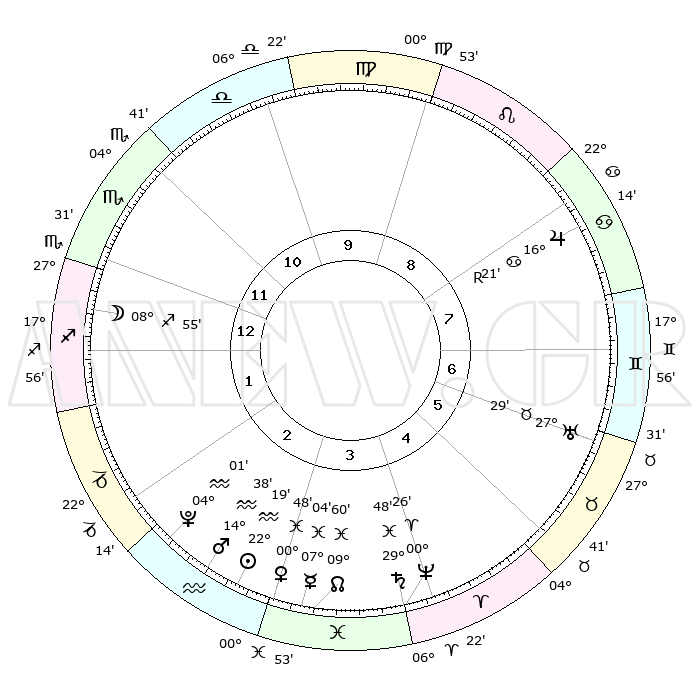 | | ΘΕΣΕΙΣ ΠΛΑΝΗΤΩΝ ΑΣΤΡΟΛΟΓΙΚΟΥ ΧΑΡΤΗ ΤΗΣ ΣΤΙΓΜΗΣ ΑΥΤΗΣ | | | | Πλανήτης | Ζώδιο | Μοίρες | Δεκαήμ. | Σε οίκο | Απόκλιση | | Ακμές των οίκων | | Ηλιος | Υδροχόος | 22°15' | Τρίτο | 3 | 14 S 05 | | 1ος | 27°25' | Σκορπιός | | Σελήνη | Τοξότης | 08°06' | Πρώτο | 1 | 26 S 50 | | 2ος | 28°12' | Τοξότης | | Ερμής | Ιχθείς | 06°57' | Πρώτο | 3 | 09 S 39 | | 3ος | 03°29' | Υδροχόος | | Αφροδίτη | Ιχθείς | 00°43' | Πρώτο | 3 | 12 S 35 | | 4ος | 09°27' | Ιχθείς | | Αρης | Υδροχόος | 14°34' | Δεύτερο | 3 | 17 S 29 | | 5ος | 10°48' | Κριός | | Δίας | Καρκίνος | 16°21'R | Δεύτερο | 8 | 22 N 45 | | 6ος | 06°12' | Ταύρος | | Κρόνος | Ιχθείς | 29°47' | Τρίτο | 4 | 02 S 04 | | 7ος | 27°25' | Ταύρος | | Ουρανός | Ταύρος | 27°29' | Τρίτο | 7 | 19 N 25 | | 8ος | 28°12' | Δίδυμοι | | Ποσειδώνας | Κριός | 00°26' | Πρώτο | 4 | 01 S 02 | | 9ος | 03°29' | Λέων | | Πλούτωνας | Υδροχόος | 04°01' | Πρώτο | 3 | 22 S 58 | | 10ος | 09°27' | Παρθένος | | Β. Δεσμός | Ιχθείς | 09°60' | Πρώτο | 4 | 07 S 49 | | 11ος | 10°48' | Ζυγός | | Ωροσκόπος | Σκορπιός | 27°25' | Τρίτο | | | 12ος | 06°12' | Σκορπιός | | Μεσουράνημα | Παρθένος | 09°27' | Πρώτο | | | |