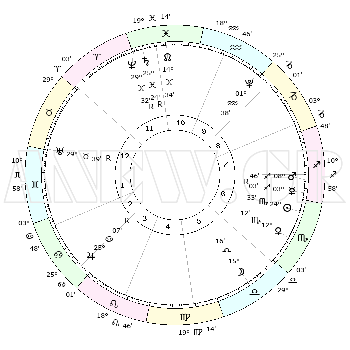 | | ΘΕΣΕΙΣ ΠΛΑΝΗΤΩΝ ΑΣΤΡΟΛΟΓΙΚΟΥ ΧΑΡΤΗ ΤΗΣ ΣΤΙΓΜΗΣ ΑΥΤΗΣ | | | | Πλανήτης | Ζώδιο | Μοίρες | Δεκαήμ. | Σε οίκο | Απόκλιση | | Ακμές των οίκων | | Ηλιος | Σκορπιός | 24°28' | Τρίτο | 7 | 18 S 53 | | 1ος | 29°31' | Κριός | | Σελήνη | Ζυγός | 14°11' | Δεύτερο | 6 | 07 S 47 | | 2ος | 01°52' | Δίδυμοι | | Ερμής | Τοξότης | 03°08'R | Πρώτο | 8 | 21 S 30 | | 3ος | 25°29' | Δίδυμοι | | Αφροδίτη | Σκορπιός | 12°06' | Δεύτερο | 7 | 14 S 21 | | 4ος | 17°10' | Καρκίνος | | Αρης | Τοξότης | 08°42' | Πρώτο | 8 | 22 S 17 | | 5ος | 11°31' | Λέων | | Δίας | Καρκίνος | 25°07'R | Τρίτο | 4 | 21 N 14 | | 6ος | 14°08' | Παρθένος | | Κρόνος | Ιχθείς | 25°24'R | Τρίτο | 12 | 04 S 03 | | 7ος | 29°31' | Ζυγός | | Ουρανός | Ταύρος | 29°39'R | Τρίτο | 1 | 19 N 52 | | 8ος | 01°52' | Τοξότης | | Ποσειδώνας | Ιχθείς | 29°32'R | Τρίτο | 12 | 01 S 26 | | 9ος | 25°29' | Τοξότης | | Πλούτωνας | Υδροχόος | 01°38' | Πρώτο | 10 | 23 S 28 | | 10ος | 17°10' | Αιγόκερως | | Β. Δεσμός | Ιχθείς | 14°34' | Δεύτερο | 12 | 06 S 04 | | 11ος | 11°31' | Υδροχόος | | Ωροσκόπος | Κριός | 29°31' | Τρίτο | | | 12ος | 14°08' | Ιχθείς | | Μεσουράνημα | Αιγόκερως | 17°10' | Δεύτερο | | | |