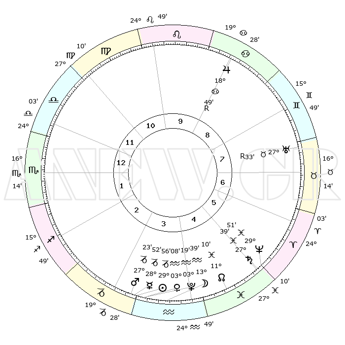 | | ΘΕΣΕΙΣ ΠΛΑΝΗΤΩΝ ΑΣΤΡΟΛΟΓΙΚΟΥ ΧΑΡΤΗ ΤΗΣ ΣΤΙΓΜΗΣ ΑΥΤΗΣ | | | | Πλανήτης | Ζώδιο | Μοίρες | Δεκαήμ. | Σε οίκο | Απόκλιση | | Ακμές των οίκων | | Ηλιος | Αιγόκερως | 29°51' | Τρίτο | 4 | 20 S 11 | | 1ος | 20°12' | Ζυγός | | Σελήνη | Υδροχόος | 12°31' | Δεύτερο | 4 | 19 S 17 | | 2ος | 18°03' | Σκορπιός | | Ερμής | Αιγόκερως | 28°43' | Τρίτο | 4 | 22 S 23 | | 3ος | 19°21' | Τοξότης | | Αφροδίτη | Υδροχόος | 03°01' | Πρώτο | 4 | 20 S 34 | | 4ος | 22°57' | Αιγόκερως | | Αρης | Αιγόκερως | 27°19' | Τρίτο | 4 | 21 S 40 | | 5ος | 25°54' | Υδροχόος | | Δίας | Καρκίνος | 18°50'R | Δεύτερο | 9 | 22 N 23 | | 6ος | 25°20' | Ιχθείς | | Κρόνος | Ιχθείς | 27°39' | Τρίτο | 6 | 02 S 57 | | 7ος | 20°12' | Κριός | | Ουρανός | Ταύρος | 27°33'R | Τρίτο | 8 | 19 N 25 | | 8ος | 18°03' | Ταύρος | | Ποσειδώνας | Ιχθείς | 29°50' | Τρίτο | 6 | 01 S 17 | | 9ος | 19°21' | Δίδυμοι | | Πλούτωνας | Υδροχόος | 03°19' | Πρώτο | 4 | 23 S 06 | | 10ος | 22°57' | Καρκίνος | | Β. Δεσμός | Ιχθείς | 11°10' | Δεύτερο | 5 | 07 S 23 | | 11ος | 25°54' | Λέων | | Ωροσκόπος | Ζυγός | 20°12' | Τρίτο | | | 12ος | 25°20' | Παρθένος | | Μεσουράνημα | Καρκίνος | 22°57' | Τρίτο | | | |