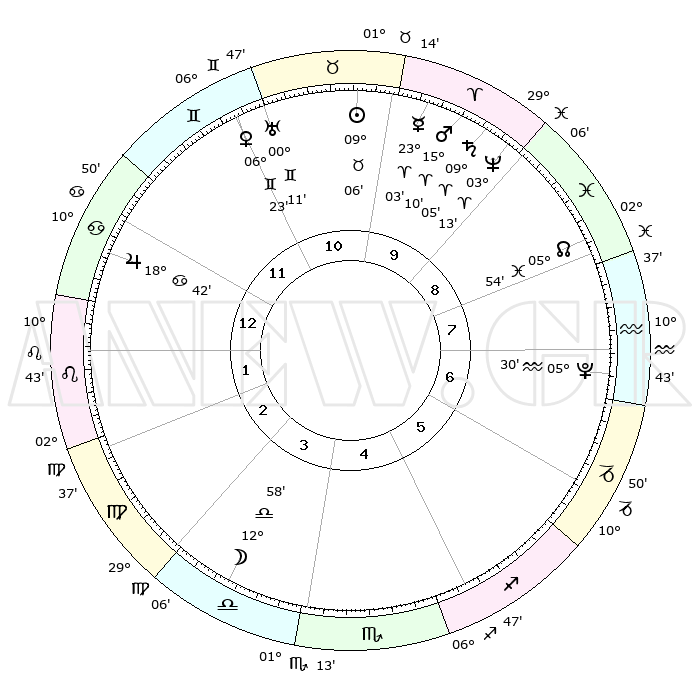 | | ΘΕΣΕΙΣ ΠΛΑΝΗΤΩΝ ΑΣΤΡΟΛΟΓΙΚΟΥ ΧΑΡΤΗ ΤΗΣ ΣΤΙΓΜΗΣ ΑΥΤΗΣ | | | | Πλανήτης | Ζώδιο | Μοίρες | Δεκαήμ. | Σε οίκο | Απόκλιση | | Ακμές των οίκων | | Ηλιος | Ταύρος | 09°04' | Πρώτο | 10 | 14 N 31 | | 1ος | 28°35' | Καρκίνος | | Σελήνη | Ζυγός | 12°27' | Δεύτερο | 3 | 07 S 37 | | 2ος | 19°32' | Λέων | | Ερμής | Κριός | 22°59' | Τρίτο | 10 | 06 N 59 | | 3ος | 14°24' | Παρθένος | | Αφροδίτη | Δίδυμοι | 06°19' | Πρώτο | 11 | 22 N 10 | | 4ος | 15°15' | Ζυγός | | Αρης | Κριός | 15°08' | Δεύτερο | 9 | 05 N 08 | | 5ος | 21°19' | Σκορπιός | | Δίας | Καρκίνος | 18°42' | Δεύτερο | 12 | 22 N 31 | | 6ος | 27°16' | Τοξότης | | Κρόνος | Κριός | 09°05' | Πρώτο | 9 | 01 N 36 | | 7ος | 28°35' | Αιγόκερως | | Ουρανός | Δίδυμοι | 00°11' | Πρώτο | 11 | 20 N 01 | | 8ος | 19°32' | Υδροχόος | | Ποσειδώνας | Κριός | 03°13' | Πρώτο | 9 | 00 N 04 | | 9ος | 14°24' | Ιχθείς | | Πλούτωνας | Υδροχόος | 05°30' | Πρώτο | 7 | 22 S 49 | | 10ος | 15°15' | Κριός | | Β. Δεσμός | Ιχθείς | 05°54' | Πρώτο | 8 | 09 S 21 | | 11ος | 21°19' | Ταύρος | | Ωροσκόπος | Καρκίνος | 28°35' | Τρίτο | | | 12ος | 27°16' | Δίδυμοι | | Μεσουράνημα | Κριός | 15°15' | Δεύτερο | | | |