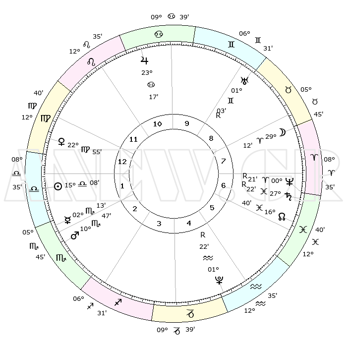 | ΘΕΣΕΙΣ ΠΛΑΝΗΤΩΝ ΑΣΤΡΟΛΟΓΙΚΟΥ ΧΑΡΤΗ ΤΗΣ ΣΤΙΓΜΗΣ ΑΥΤΗΣ | | Πλανήτης | Ζώδιο | Μοίρες | Δεκαήμ. | Σε οίκο | Απόκλιση | | Ακμές των οίκων | Ηλιος | Ζυγός | 15°02' | Δεύτερο | 2 | 05 S 55 | | 1ος | 10°46' | Παρθένος | Σελήνη | Κριός | 27°47' | Τρίτο | 8 | 13 N 47 | | 2ος | 05°43' | Ζυγός | Ερμής | Σκορπιός | 02°04' | Πρώτο | 2 | 13 S 05 | | 3ος | 05°13' | Σκορπιός | Αφροδίτη | Παρθένος | 22°48' | Τρίτο | 1 | 04 N 10 | | 4ος | 08°10' | Τοξότης | Αρης | Σκορπιός | 10°43' | Δεύτερο | 3 | 15 S 11 | | 5ος | 11°43' | Αιγόκερως | Δίας | Καρκίνος | 23°16' | Τρίτο | 11 | 21 N 28 | | 6ος | 12°58' | Υδροχόος | Κρόνος | Ιχθείς | 27°22'R | Τρίτο | 7 | 03 S 21 | | 7ος | 10°46' | Ιχθείς | Ουρανός | Δίδυμοι | 01°03'R | Πρώτο | 9 | 20 N 09 | | 8ος | 05°43' | Κριός | Ποσειδώνας | Κριός | 00°21'R | Πρώτο | 7 | 01 S 07 | | 9ος | 05°13' | Ταύρος | Πλούτωνας | Υδροχόος | 01°22'R | Πρώτο | 5 | 23 S 32 | | 10ος | 08°10' | Δίδυμοι | Β. Δεσμός | Ιχθείς | 16°40' | Δεύτερο | 7 | 05 S 16 | | 11ος | 11°43' | Καρκίνος | Ωροσκόπος | Παρθένος | 10°46' | Δεύτερο | | | 12ος | 12°58' | Λέων | Μεσουράνημα | Δίδυμοι | 08°10' | Πρώτο | | | |