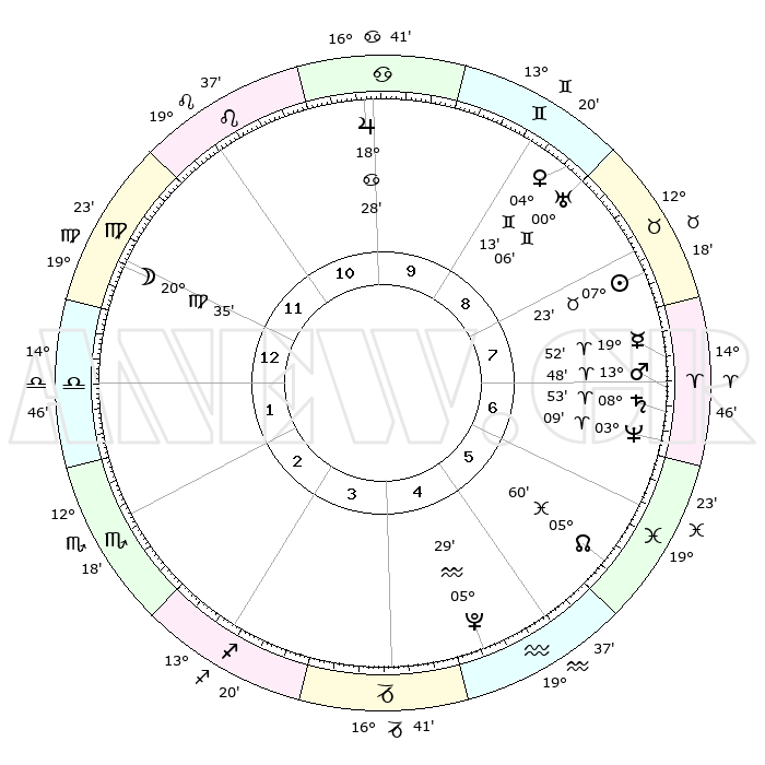 | | ΘΕΣΕΙΣ ΠΛΑΝΗΤΩΝ ΑΣΤΡΟΛΟΓΙΚΟΥ ΧΑΡΤΗ ΤΗΣ ΣΤΙΓΜΗΣ ΑΥΤΗΣ | | | | Πλανήτης | Ζώδιο | Μοίρες | Δεκαήμ. | Σε οίκο | Απόκλιση | | Ακμές των οίκων | | Ηλιος | Ταύρος | 07°19' | Πρώτο | 8 | 13 N 57 | | 1ος | 26°08' | Παρθένος | | Σελήνη | Παρθένος | 19°47' | Δεύτερο | 12 | 03 N 02 | | 2ος | 22°26' | Ζυγός | | Ερμής | Κριός | 19°46' | Δεύτερο | 7 | 05 N 38 | | 3ος | 22°43' | Σκορπιός | | Αφροδίτη | Δίδυμοι | 04°09' | Πρώτο | 9 | 21 N 42 | | 4ος | 25°40' | Τοξότης | | Αρης | Κριός | 13°45' | Δεύτερο | 7 | 04 N 35 | | 5ος | 28°42' | Αιγόκερως | | Δίας | Καρκίνος | 18°27' | Δεύτερο | 10 | 22 N 33 | | 6ος | 29°17' | Υδροχόος | | Κρόνος | Κριός | 08°52' | Πρώτο | 7 | 01 N 32 | | 7ος | 26°08' | Ιχθείς | | Ουρανός | Δίδυμοι | 00°05' | Πρώτο | 9 | 20 N 00 | | 8ος | 22°26' | Κριός | | Ποσειδώνας | Κριός | 03°09' | Πρώτο | 7 | 00 N 03 | | 9ος | 22°43' | Ταύρος | | Πλούτωνας | Υδροχόος | 05°29' | Πρώτο | 5 | 22 S 48 | | 10ος | 25°40' | Δίδυμοι | | Β. Δεσμός | Ιχθείς | 05°60' | Πρώτο | 6 | 09 S 19 | | 11ος | 28°42' | Καρκίνος | | Ωροσκόπος | Παρθένος | 26°08' | Τρίτο | | | 12ος | 29°17' | Λέων | | Μεσουράνημα | Δίδυμοι | 25°40' | Τρίτο | | | |