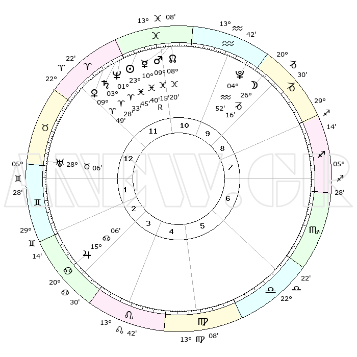 | | ΘΕΣΕΙΣ ΠΛΑΝΗΤΩΝ ΑΣΤΡΟΛΟΓΙΚΟΥ ΧΑΡΤΗ ΤΗΣ ΣΤΙΓΜΗΣ ΑΥΤΗΣ | | | | Πλανήτης | Ζώδιο | Μοίρες | Δεκαήμ. | Σε οίκο | Απόκλιση | | Ακμές των οίκων | | Ηλιος | Ιχθείς | 23°41' | Τρίτο | 12 | 02 S 30 | | 1ος | 02°29' | Ταύρος | | Σελήνη | Αιγόκερως | 25°23' | Τρίτο | 10 | 24 S 38 | | 2ος | 04°01' | Δίδυμοι | | Ερμής | Ιχθείς | 10°43'R | Δεύτερο | 11 | 05 S 09 | | 3ος | 27°20' | Δίδυμοι | | Αφροδίτη | Κριός | 09°43' | Πρώτο | 12 | 02 N 52 | | 4ος | 19°02' | Καρκίνος | | Αρης | Ιχθείς | 09°12' | Πρώτο | 11 | 09 S 08 | | 5ος | 13°41' | Λέων | | Δίας | Καρκίνος | 15°06' | Δεύτερο | 3 | 22 N 56 | | 6ος | 16°53' | Παρθένος | | Κρόνος | Κριός | 03°27' | Πρώτο | 12 | 00 S 35 | | 7ος | 02°28' | Σκορπιός | | Ουρανός | Ταύρος | 28°05' | Τρίτο | 1 | 19 N 33 | | 8ος | 04°01' | Τοξότης | | Ποσειδώνας | Κριός | 01°32' | Πρώτο | 12 | 00 S 35 | | 9ος | 27°19' | Τοξότης | | Πλούτωνας | Υδροχόος | 04°52' | Πρώτο | 10 | 22 S 50 | | 10ος | 19°02' | Αιγόκερως | | Β. Δεσμός | Ιχθείς | 08°21' | Πρώτο | 11 | 08 S 26 | | 11ος | 13°41' | Υδροχόος | | Ωροσκόπος | Ταύρος | 02°29' | Πρώτο | | | 12ος | 16°53' | Ιχθείς | | Μεσουράνημα | Αιγόκερως | 19°02' | Δεύτερο | | | |