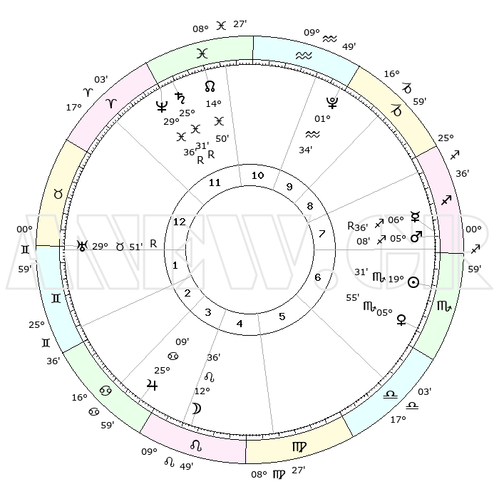 | | ΘΕΣΕΙΣ ΠΛΑΝΗΤΩΝ ΑΣΤΡΟΛΟΓΙΚΟΥ ΧΑΡΤΗ ΤΗΣ ΣΤΙΓΜΗΣ ΑΥΤΗΣ | | | | Πλανήτης | Ζώδιο | Μοίρες | Δεκαήμ. | Σε οίκο | Απόκλιση | | Ακμές των οίκων | | Ηλιος | Σκορπιός | 19°27' | Δεύτερο | 7 | 17 S 35 | | 1ος | 27°46' | Κριός | | Σελήνη | Λέων | 11°41' | Δεύτερο | 5 | 20 N 03 | | 2ος | 00°36' | Δίδυμοι | | Ερμής | Τοξότης | 06°37'R | Πρώτο | 8 | 23 S 25 | | 3ος | 24°24' | Δίδυμοι | | Αφροδίτη | Σκορπιός | 05°50' | Πρώτο | 7 | 12 S 15 | | 4ος | 16°05' | Καρκίνος | | Αρης | Τοξότης | 05°05' | Πρώτο | 8 | 21 S 38 | | 5ος | 10°16' | Λέων | | Δίας | Καρκίνος | 25°09' | Τρίτο | 4 | 21 N 12 | | 6ος | 12°32' | Παρθένος | | Κρόνος | Ιχθείς | 25°32'R | Τρίτο | 12 | 04 S 01 | | 7ος | 27°46' | Ζυγός | | Ουρανός | Ταύρος | 29°51'R | Τρίτο | 1 | 19 N 55 | | 8ος | 00°36' | Τοξότης | | Ποσειδώνας | Ιχθείς | 29°36'R | Τρίτο | 12 | 01 S 25 | | 9ος | 24°24' | Τοξότης | | Πλούτωνας | Υδροχόος | 01°34' | Πρώτο | 10 | 23 S 29 | | 10ος | 16°04' | Αιγόκερως | | Β. Δεσμός | Ιχθείς | 14°50' | Δεύτερο | 12 | 05 S 58 | | 11ος | 10°16' | Υδροχόος | | Ωροσκόπος | Κριός | 27°46' | Τρίτο | | | 12ος | 12°32' | Ιχθείς | | Μεσουράνημα | Αιγόκερως | 16°04' | Δεύτερο | | | |