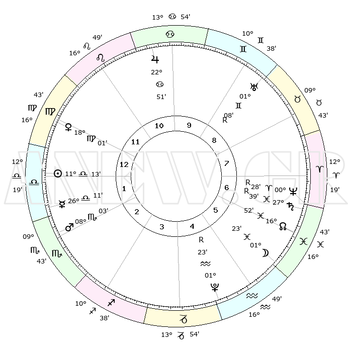 | ΘΕΣΕΙΣ ΠΛΑΝΗΤΩΝ ΑΣΤΡΟΛΟΓΙΚΟΥ ΧΑΡΤΗ ΤΗΣ ΣΤΙΓΜΗΣ ΑΥΤΗΣ | | Πλανήτης | Ζώδιο | Μοίρες | Δεκαήμ. | Σε οίκο | Απόκλιση | | Ακμές των οίκων | Ηλιος | Ζυγός | 11°07' | Δεύτερο | 2 | 04 S 24 | | 1ος | 12°52' | Παρθένος | Σελήνη | Ιχθείς | 00°00' | Πρώτο | 6 | 13 S 00 | | 2ος | 08°01' | Ζυγός | Ερμής | Ζυγός | 26°02' | Τρίτο | 2 | 10 S 30 | | 3ος | 07°38' | Σκορπιός | Αφροδίτη | Παρθένος | 17°53' | Δεύτερο | 1 | 06 N 02 | | 4ος | 10°35' | Τοξότης | Αρης | Σκορπιός | 07°59' | Πρώτο | 3 | 14 S 16 | | 5ος | 14°02' | Αιγόκερως | Δίας | Καρκίνος | 22°50' | Τρίτο | 11 | 21 N 32 | | 6ος | 15°11' | Υδροχόος | Κρόνος | Ιχθείς | 27°39'R | Τρίτο | 7 | 03 S 14 | | 7ος | 12°52' | Ιχθείς | Ουρανός | Δίδυμοι | 01°08'R | Πρώτο | 9 | 20 N 11 | | 8ος | 08°01' | Κριός | Ποσειδώνας | Κριός | 00°28'R | Πρώτο | 7 | 01 S 05 | | 9ος | 07°38' | Ταύρος | Πλούτωνας | Υδροχόος | 01°23'R | Πρώτο | 5 | 23 S 32 | | 10ος | 10°35' | Δίδυμοι | Β. Δεσμός | Ιχθείς | 16°53' | Δεύτερο | 7 | 05 S 11 | | 11ος | 14°02' | Καρκίνος | Ωροσκόπος | Παρθένος | 12°52' | Δεύτερο | | | 12ος | 15°11' | Λέων | Μεσουράνημα | Δίδυμοι | 10°35' | Δεύτερο | | | |
