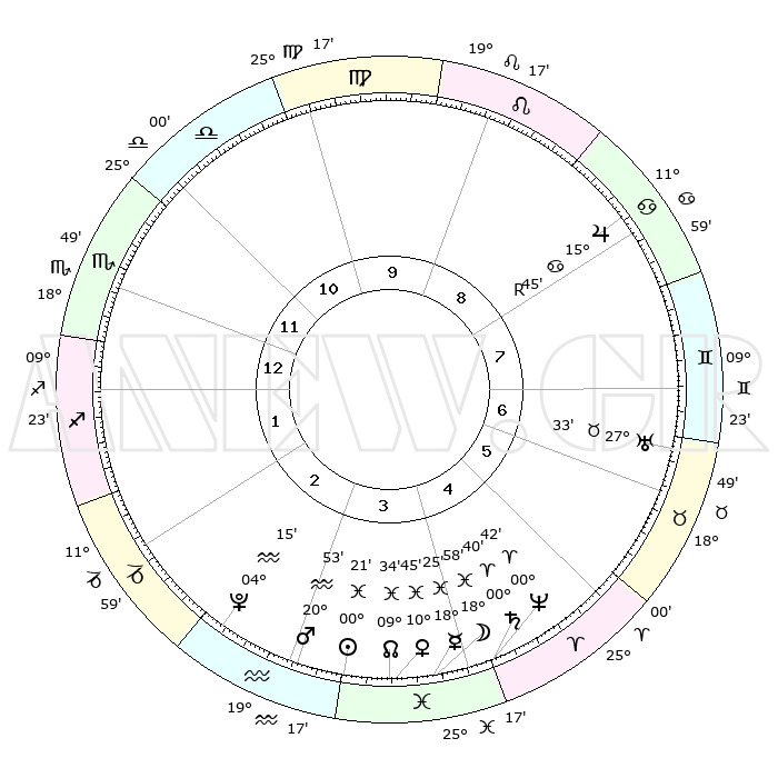 | | ΘΕΣΕΙΣ ΠΛΑΝΗΤΩΝ ΑΣΤΡΟΛΟΓΙΚΟΥ ΧΑΡΤΗ ΤΗΣ ΣΤΙΓΜΗΣ ΑΥΤΗΣ | | | | Πλανήτης | Ζώδιο | Μοίρες | Δεκαήμ. | Σε οίκο | Απόκλιση | | Ακμές των οίκων | | Ηλιος | Ιχθείς | 00°17' | Πρώτο | 4 | 11 S 22 | | 1ος | 16°26' | Σκορπιός | | Σελήνη | Ιχθείς | 17°54' | Δεύτερο | 4 | 04 S 01 | | 2ος | 16°02' | Τοξότης | | Ερμής | Ιχθείς | 18°20' | Δεύτερο | 4 | 03 S 43 | | 3ος | 19°42' | Αιγόκερως | | Αφροδίτη | Ιχθείς | 10°39' | Δεύτερο | 4 | 08 S 55 | | 4ος | 25°04' | Υδροχόος | | Αρης | Υδροχόος | 20°49' | Τρίτο | 3 | 15 S 35 | | 5ος | 27°24' | Ιχθείς | | Δίας | Καρκίνος | 15°45'R | Δεύτερο | 8 | 22 N 50 | | 6ος | 24°16' | Κριός | | Κρόνος | Κριός | 00°40' | Πρώτο | 5 | 01 S 42 | | 7ος | 16°26' | Ταύρος | | Ουρανός | Ταύρος | 27°33' | Τρίτο | 7 | 19 N 26 | | 8ος | 16°02' | Δίδυμοι | | Ποσειδώνας | Κριός | 00°42' | Πρώτο | 5 | 00 S 55 | | 9ος | 19°42' | Καρκίνος | | Πλούτωνας | Υδροχόος | 04°15' | Πρώτο | 3 | 22 S 55 | | 10ος | 25°04' | Λέων | | Β. Δεσμός | Ιχθείς | 09°35' | Πρώτο | 4 | 07 S 59 | | 11ος | 27°24' | Παρθένος | | Ωροσκόπος | Σκορπιός | 16°26' | Δεύτερο | | | 12ος | 24°16' | Ζυγός | | Μεσουράνημα | Λέων | 25°04' | Τρίτο | | | |