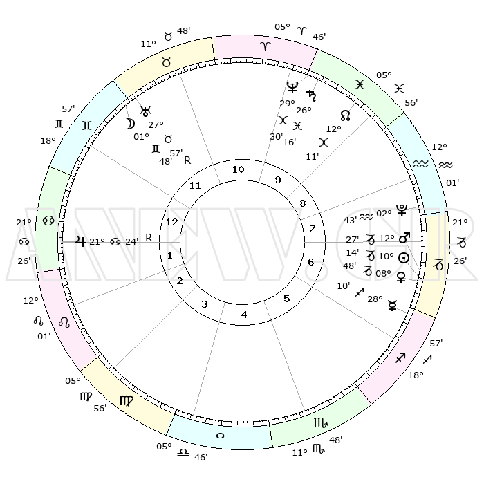 | | ΘΕΣΕΙΣ ΠΛΑΝΗΤΩΝ ΑΣΤΡΟΛΟΓΙΚΟΥ ΧΑΡΤΗ ΤΗΣ ΣΤΙΓΜΗΣ ΑΥΤΗΣ | | | | Πλανήτης | Ζώδιο | Μοίρες | Δεκαήμ. | Σε οίκο | Απόκλιση | | Ακμές των οίκων | | Ηλιος | Αιγόκερως | 10°09' | Δεύτερο | 7 | 23 S 03 | | 1ος | 27°11' | Δίδυμοι | | Σελήνη | Δίδυμοι | 00°39' | Πρώτο | 12 | 25 N 09 | | 2ος | 18°10' | Καρκίνος | | Ερμής | Τοξότης | 28°03' | Τρίτο | 7 | 23 S 57 | | 3ος | 09°48' | Λέων | | Αφροδίτη | Αιγόκερως | 08°42' | Πρώτο | 7 | 23 S 38 | | 4ος | 05°40' | Παρθένος | | Αρης | Αιγόκερως | 12°23' | Δεύτερο | 7 | 23 S 44 | | 5ος | 09°09' | Ζυγός | | Δίας | Καρκίνος | 21°24'R | Τρίτο | 2 | 21 N 58 | | 6ος | 19°19' | Σκορπιός | | Κρόνος | Ιχθείς | 26°16' | Τρίτο | 10 | 03 S 34 | | 7ος | 27°11' | Τοξότης | | Ουρανός | Ταύρος | 27°57'R | Τρίτο | 12 | 19 N 30 | | 8ος | 18°10' | Αιγόκερως | | Ποσειδώνας | Ιχθείς | 29°30' | Τρίτο | 10 | 01 S 25 | | 9ος | 09°48' | Υδροχόος | | Πλούτωνας | Υδροχόος | 02°43' | Πρώτο | 8 | 23 S 13 | | 10ος | 05°40' | Ιχθείς | | Β. Δεσμός | Ιχθείς | 12°11' | Δεύτερο | 10 | 06 S 59 | | 11ος | 09°09' | Κριός | | Ωροσκόπος | Δίδυμοι | 27°11' | Τρίτο | | | 12ος | 19°19' | Ταύρος | | Μεσουράνημα | Ιχθείς | 05°40' | Πρώτο | | | |