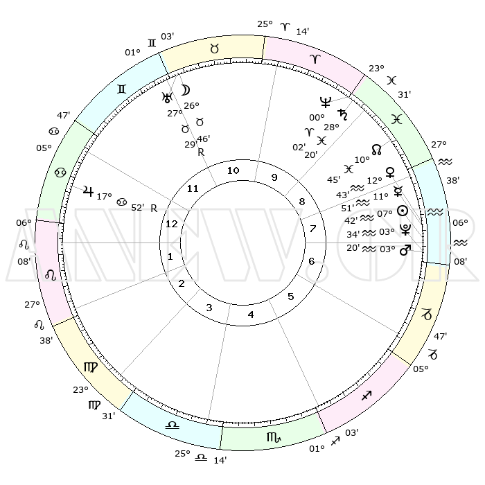 | | ΘΕΣΕΙΣ ΠΛΑΝΗΤΩΝ ΑΣΤΡΟΛΟΓΙΚΟΥ ΧΑΡΤΗ ΤΗΣ ΣΤΙΓΜΗΣ ΑΥΤΗΣ | | | | Πλανήτης | Ζώδιο | Μοίρες | Δεκαήμ. | Σε οίκο | Απόκλιση | | Ακμές των οίκων | | Ηλιος | Υδροχόος | 07°38' | Πρώτο | 8 | 18 S 21 | | 1ος | 12°37' | Καρκίνος | | Σελήνη | Ταύρος | 25°38' | Τρίτο | 11 | 24 N 04 | | 2ος | 03°03' | Λέων | | Ερμής | Υδροχόος | 11°43' | Δεύτερο | 8 | 19 S 15 | | 3ος | 25°56' | Λέων | | Αφροδίτη | Υδροχόος | 12°37' | Δεύτερο | 8 | 18 S 15 | | 4ος | 24°21' | Παρθένος | | Αρης | Υδροχόος | 03°16' | Πρώτο | 8 | 20 S 25 | | 5ος | 29°52' | Ζυγός | | Δίας | Καρκίνος | 17°52'R | Δεύτερο | 1 | 22 N 32 | | 6ος | 08°26' | Τοξότης | | Κρόνος | Ιχθείς | 28°20' | Τρίτο | 10 | 02 S 40 | | 7ος | 12°37' | Αιγόκερως | | Ουρανός | Ταύρος | 27°29'R | Τρίτο | 11 | 19 N 24 | | 8ος | 03°03' | Υδροχόος | | Ποσειδώνας | Κριός | 00°02' | Πρώτο | 10 | 01 S 12 | | 9ος | 25°56' | Υδροχόος | | Πλούτωνας | Υδροχόος | 03°34' | Πρώτο | 8 | 23 S 03 | | 10ος | 24°21' | Ιχθείς | | Β. Δεσμός | Ιχθείς | 10°46' | Δεύτερο | 9 | 07 S 32 | | 11ος | 29°52' | Κριός | | Ωροσκόπος | Καρκίνος | 12°37' | Δεύτερο | | | 12ος | 08°26' | Δίδυμοι | | Μεσουράνημα | Ιχθείς | 24°21' | Τρίτο | | | |