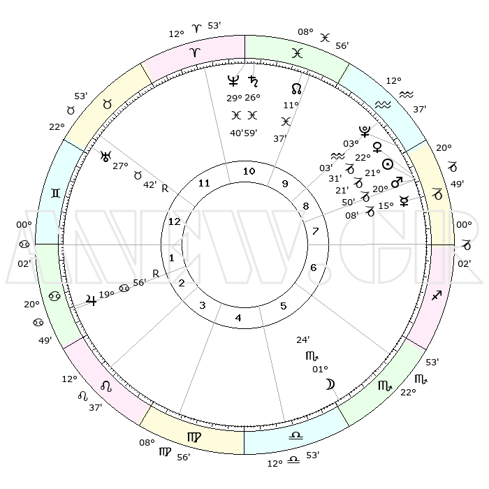 | | ΘΕΣΕΙΣ ΠΛΑΝΗΤΩΝ ΑΣΤΡΟΛΟΓΙΚΟΥ ΧΑΡΤΗ ΤΗΣ ΣΤΙΓΜΗΣ ΑΥΤΗΣ | | | | Πλανήτης | Ζώδιο | Μοίρες | Δεκαήμ. | Σε οίκο | Απόκλιση | | Ακμές των οίκων | | Ηλιος | Αιγόκερως | 20°59' | Τρίτο | 1 | 21 S 48 | | 1ος | 09°41' | Αιγόκερως | | Σελήνη | Ζυγός | 27°03' | Τρίτο | 9 | 13 S 54 | | 2ος | 19°19' | Υδροχόος | | Ερμής | Αιγόκερως | 14°33' | Δεύτερο | 1 | 24 S 10 | | 3ος | 29°37' | Ιχθείς | | Αφροδίτη | Αιγόκερως | 22°04' | Τρίτο | 1 | 22 S 29 | | 4ος | 01°51' | Ταύρος | | Αρης | Αιγόκερως | 20°33' | Τρίτο | 1 | 22 S 48 | | 5ος | 26°44' | Ταύρος | | Δίας | Καρκίνος | 19°59'R | Δεύτερο | 7 | 22 N 12 | | 6ος | 18°05' | Δίδυμοι | | Κρόνος | Ιχθείς | 26°57' | Τρίτο | 2 | 03 S 15 | | 7ος | 09°41' | Καρκίνος | | Ουρανός | Ταύρος | 27°42'R | Τρίτο | 5 | 19 N 27 | | 8ος | 19°19' | Λέων | | Ποσειδώνας | Ιχθείς | 29°40' | Τρίτο | 3 | 01 S 21 | | 9ος | 29°37' | Παρθένος | | Πλούτωνας | Υδροχόος | 03°02' | Πρώτο | 1 | 23 S 09 | | 10ος | 01°51' | Σκορπιός | | Β. Δεσμός | Ιχθείς | 11°38' | Δεύτερο | 2 | 07 S 12 | | 11ος | 26°44' | Σκορπιός | | Ωροσκόπος | Αιγόκερως | 09°41' | Πρώτο | | | 12ος | 18°04' | Τοξότης | | Μεσουράνημα | Σκορπιός | 01°51' | Πρώτο | | | |