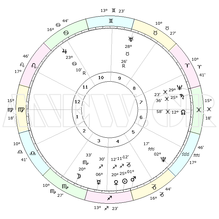 | | ΘΕΣΕΙΣ ΠΛΑΝΗΤΩΝ ΑΣΤΡΟΛΟΓΙΚΟΥ ΧΑΡΤΗ ΤΗΣ ΣΤΙΓΜΗΣ ΑΥΤΗΣ | | | | Πλανήτης | Ζώδιο | Μοίρες | Δεκαήμ. | Σε οίκο | Απόκλιση | | Ακμές των οίκων | | Ηλιος | Τοξότης | 24°51' | Τρίτο | 7 | 23 S 20 | | 1ος | 00°34' | Δίδυμοι | | Σελήνη | Σκορπιός | 16°37' | Δεύτερο | 6 | 21 S 06 | | 2ος | 25°16' | Δίδυμοι | | Ερμής | Τοξότης | 06°03' | Πρώτο | 7 | 19 S 59 | | 3ος | 16°40' | Καρκίνος | | Αφροδίτη | Τοξότης | 19°47' | Δεύτερο | 7 | 22 S 56 | | 4ος | 09°28' | Λέων | | Αρης | Αιγόκερως | 00°57' | Πρώτο | 8 | 24 S 13 | | 5ος | 08°02' | Παρθένος | | Δίας | Καρκίνος | 23°12'R | Τρίτο | 3 | 21 N 38 | | 6ος | 16°34' | Ζυγός | | Κρόνος | Ιχθείς | 25°35' | Τρίτο | 11 | 03 S 53 | | 7ος | 00°34' | Τοξότης | | Ουρανός | Ταύρος | 28°26'R | Τρίτο | 12 | 19 N 37 | | 8ος | 25°16' | Τοξότης | | Ποσειδώνας | Ιχθείς | 29°23' | Τρίτο | 11 | 01 S 29 | | 9ος | 16°40' | Αιγόκερως | | Πλούτωνας | Υδροχόος | 02°17' | Πρώτο | 9 | 23 S 19 | | 10ος | 09°28' | Υδροχόος | | Β. Δεσμός | Ιχθείς | 12°59' | Δεύτερο | 11 | 06 S 41 | | 11ος | 08°02' | Ιχθείς | | Ωροσκόπος | Δίδυμοι | 00°34' | Πρώτο | | | 12ος | 16°34' | Κριός | | Μεσουράνημα | Υδροχόος | 09°28' | Πρώτο | | | |