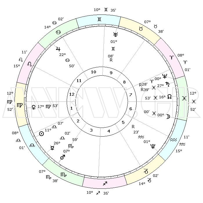 | ΘΕΣΕΙΣ ΠΛΑΝΗΤΩΝ ΑΣΤΡΟΛΟΓΙΚΟΥ ΧΑΡΤΗ ΤΗΣ ΣΤΙΓΜΗΣ ΑΥΤΗΣ | | Πλανήτης | Ζώδιο | Μοίρες | Δεκαήμ. | Σε οίκο | Απόκλιση | | Ακμές των οίκων | Ηλιος | Ζυγός | 11°02' | Δεύτερο | 3 | 04 S 22 | | 1ος | 18°59' | Λέων | Σελήνη | Υδροχόος | 28°53' | Τρίτο | 7 | 13 S 30 | | 2ος | 11°42' | Παρθένος | Ερμής | Ζυγός | 25°54' | Τρίτο | 3 | 10 S 26 | | 3ος | 09°13' | Ζυγός | Αφροδίτη | Παρθένος | 17°47' | Δεύτερο | 2 | 06 N 04 | | 4ος | 11°51' | Σκορπιός | Αρης | Σκορπιός | 07°56' | Πρώτο | 3 | 14 S 15 | | 5ος | 16°50' | Τοξότης | Δίας | Καρκίνος | 22°49' | Τρίτο | 12 | 21 N 32 | | 6ος | 19°50' | Αιγόκερως | Κρόνος | Ιχθείς | 27°40'R | Τρίτο | 8 | 03 S 14 | | 7ος | 18°59' | Υδροχόος | Ουρανός | Δίδυμοι | 01°09'R | Πρώτο | 10 | 20 N 11 | | 8ος | 11°42' | Ιχθείς | Ποσειδώνας | Κριός | 00°28'R | Πρώτο | 8 | 01 S 05 | | 9ος | 09°13' | Κριός | Πλούτωνας | Υδροχόος | 01°23'R | Πρώτο | 6 | 23 S 32 | | 10ος | 11°51' | Ταύρος | Β. Δεσμός | Ιχθείς | 16°53' | Δεύτερο | 8 | 05 S 11 | | 11ος | 16°50' | Δίδυμοι | Ωροσκόπος | Λέων | 18°59' | Δεύτερο | | | 12ος | 19°50' | Καρκίνος | Μεσουράνημα | Ταύρος | 11°51' | Δεύτερο | | | |