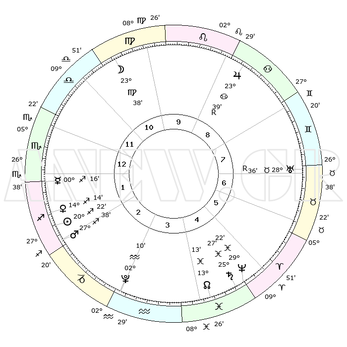 | | ΘΕΣΕΙΣ ΠΛΑΝΗΤΩΝ ΑΣΤΡΟΛΟΓΙΚΟΥ ΧΑΡΤΗ ΤΗΣ ΣΤΙΓΜΗΣ ΑΥΤΗΣ | | | | Πλανήτης | Ζώδιο | Μοίρες | Δεκαήμ. | Σε οίκο | Απόκλιση | | Ακμές των οίκων | | Ηλιος | Τοξότης | 20°17' | Τρίτο | 2 | 23 S 05 | | 1ος | 02°41' | Σκορπιός | | Σελήνη | Παρθένος | 22°36' | Τρίτο | 11 | 02 N 10 | | 2ος | 01°16' | Τοξότης | | Ερμής | Τοξότης | 00°10' | Πρώτο | 1 | 18 S 20 | | 3ος | 03°26' | Αιγόκερως | | Αφροδίτη | Τοξότης | 14°08' | Δεύτερο | 2 | 22 S 13 | | 4ος | 07°49' | Υδροχόος | | Αρης | Τοξότης | 27°34' | Τρίτο | 2 | 24 S 10 | | 5ος | 10°42' | Ιχθείς | | Δίας | Καρκίνος | 23°39'R | Τρίτο | 9 | 21 N 33 | | 6ος | 09°07' | Κριός | | Κρόνος | Ιχθείς | 25°27' | Τρίτο | 5 | 03 S 57 | | 7ος | 02°41' | Ταύρος | | Ουρανός | Ταύρος | 28°36'R | Τρίτο | 7 | 19 N 39 | | 8ος | 01°16' | Δίδυμοι | | Ποσειδώνας | Ιχθείς | 29°22' | Τρίτο | 5 | 01 S 29 | | 9ος | 03°26' | Καρκίνος | | Πλούτωνας | Υδροχόος | 02°10' | Πρώτο | 3 | 23 S 20 | | 10ος | 07°49' | Λέων | | Β. Δεσμός | Ιχθείς | 13°14' | Δεύτερο | 5 | 06 S 35 | | 11ος | 10°42' | Παρθένος | | Ωροσκόπος | Σκορπιός | 02°41' | Πρώτο | | | 12ος | 09°07' | Ζυγός | | Μεσουράνημα | Λέων | 07°49' | Πρώτο | | | |