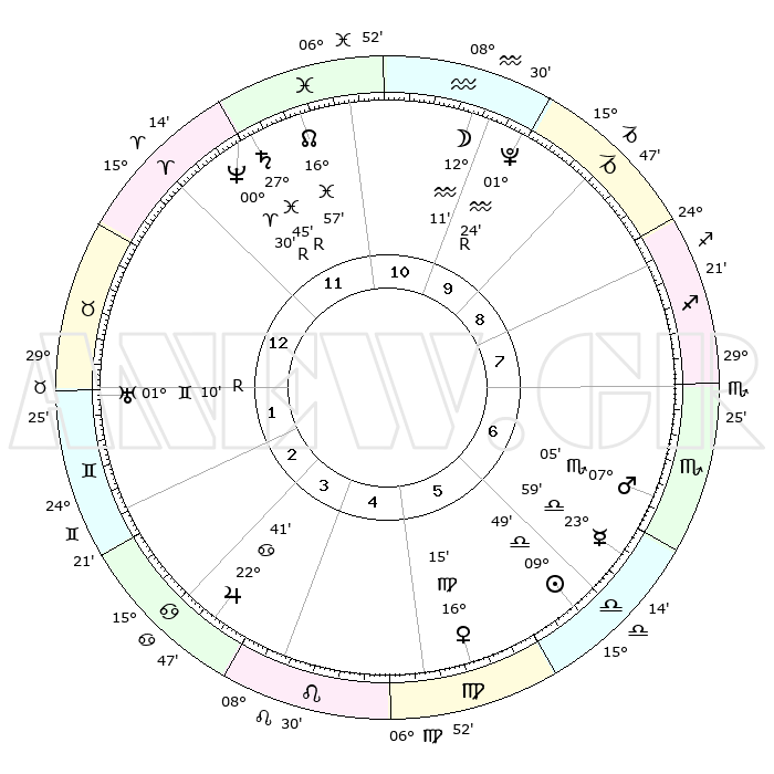 | ΘΕΣΕΙΣ ΠΛΑΝΗΤΩΝ ΑΣΤΡΟΛΟΓΙΚΟΥ ΧΑΡΤΗ ΤΗΣ ΣΤΙΓΜΗΣ ΑΥΤΗΣ | | Πλανήτης | Ζώδιο | Μοίρες | Δεκαήμ. | Σε οίκο | Απόκλιση | | Ακμές των οίκων | Ηλιος | Ζυγός | 09°45' | Πρώτο | 6 | 03 S 51 | | 1ος | 24°13' | Κριός | Σελήνη | Υδροχόος | 11°14' | Δεύτερο | 11 | 20 S 27 | | 2ος | 28°03' | Ταύρος | Ερμής | Ζυγός | 23°52' | Τρίτο | 6 | 09 S 33 | | 3ος | 22°13' | Δίδυμοι | Αφροδίτη | Παρθένος | 16°10' | Δεύτερο | 6 | 06 N 41 | | 4ος | 13°55' | Καρκίνος | Αρης | Σκορπιός | 07°02' | Πρώτο | 7 | 13 S 57 | | 5ος | 07°47' | Λέων | Δίας | Καρκίνος | 22°40' | Τρίτο | 4 | 21 N 33 | | 6ος | 09°22' | Παρθένος | Κρόνος | Ιχθείς | 27°46'R | Τρίτο | 12 | 03 S 12 | | 7ος | 24°13' | Ζυγός | Ουρανός | Δίδυμοι | 01°10'R | Πρώτο | 2 | 20 N 11 | | 8ος | 28°03' | Σκορπιός | Ποσειδώνας | Κριός | 00°30'R | Πρώτο | 12 | 01 S 04 | | 9ος | 22°13' | Τοξότης | Πλούτωνας | Υδροχόος | 01°24'R | Πρώτο | 10 | 23 S 32 | | 10ος | 13°55' | Αιγόκερως | Β. Δεσμός | Ιχθείς | 16°57' | Δεύτερο | 12 | 05 S 09 | | 11ος | 07°47' | Υδροχόος | Ωροσκόπος | Κριός | 24°13' | Τρίτο | | | 12ος | 09°22' | Ιχθείς | Μεσουράνημα | Αιγόκερως | 13°55' | Δεύτερο | | | |