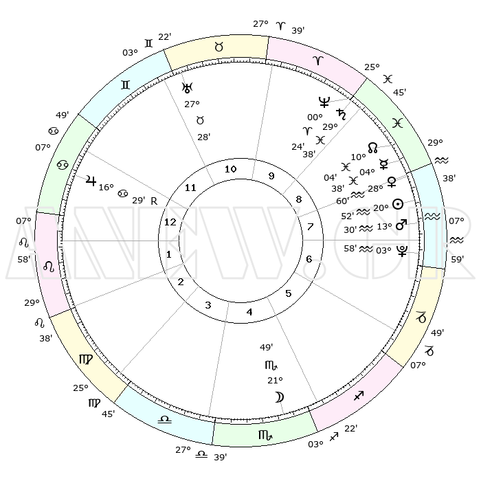 | | ΘΕΣΕΙΣ ΠΛΑΝΗΤΩΝ ΑΣΤΡΟΛΟΓΙΚΟΥ ΧΑΡΤΗ ΤΗΣ ΣΤΙΓΜΗΣ ΑΥΤΗΣ | | | | Πλανήτης | Ζώδιο | Μοίρες | Δεκαήμ. | Σε οίκο | Απόκλιση | | Ακμές των οίκων | | Ηλιος | Υδροχόος | 20°48' | Τρίτο | 8 | 14 S 33 | | 1ος | 17°57' | Καρκίνος | | Σελήνη | Σκορπιός | 21°00' | Τρίτο | 5 | 22 S 49 | | 2ος | 08°26' | Λέων | | Ερμής | Ιχθείς | 04°31' | Πρώτο | 9 | 10 S 45 | | 3ος | 01°55' | Παρθένος | | Αφροδίτη | Υδροχόος | 28°54' | Τρίτο | 8 | 13 S 13 | | 4ος | 01°12' | Ζυγός | | Αρης | Υδροχόος | 13°26' | Δεύτερο | 8 | 17 S 48 | | 5ος | 07°06' | Σκορπιός | | Δίας | Καρκίνος | 16°29'R | Δεύτερο | 12 | 22 N 44 | | 6ος | 14°50' | Τοξότης | | Κρόνος | Ιχθείς | 29°38' | Τρίτο | 9 | 02 S 08 | | 7ος | 17°57' | Αιγόκερως | | Ουρανός | Ταύρος | 27°28' | Τρίτο | 11 | 19 N 25 | | 8ος | 08°26' | Υδροχόος | | Ποσειδώνας | Κριός | 00°24' | Πρώτο | 9 | 01 S 03 | | 9ος | 01°55' | Ιχθείς | | Πλούτωνας | Υδροχόος | 03°58' | Πρώτο | 7 | 22 S 58 | | 10ος | 01°12' | Κριός | | Β. Δεσμός | Ιχθείς | 10°04' | Δεύτερο | 9 | 07 S 47 | | 11ος | 07°06' | Ταύρος | | Ωροσκόπος | Καρκίνος | 17°57' | Δεύτερο | | | 12ος | 14°50' | Δίδυμοι | | Μεσουράνημα | Κριός | 01°12' | Πρώτο | | | |