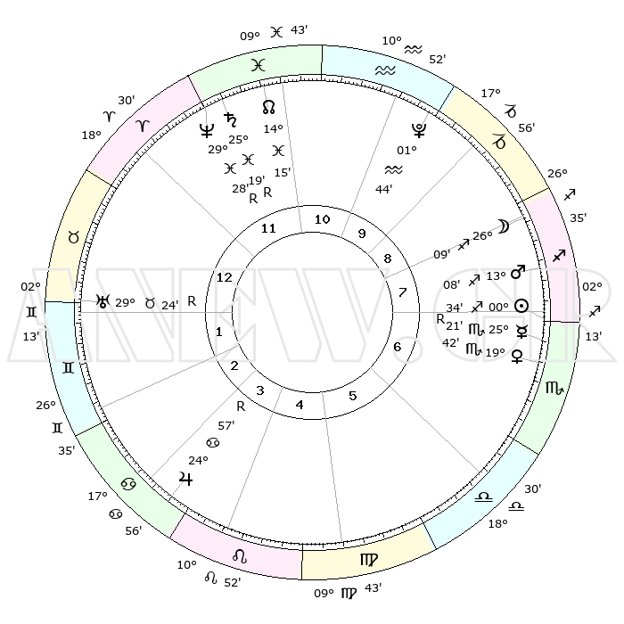 | | ΘΕΣΕΙΣ ΠΛΑΝΗΤΩΝ ΑΣΤΡΟΛΟΓΙΚΟΥ ΧΑΡΤΗ ΤΗΣ ΣΤΙΓΜΗΣ ΑΥΤΗΣ | | | | Πλανήτης | Ζώδιο | Μοίρες | Δεκαήμ. | Σε οίκο | Απόκλιση | | Ακμές των οίκων | | Ηλιος | Τοξότης | 00°31' | Πρώτο | 7 | 20 S 15 | | 1ος | 06°21' | Ταύρος | | Σελήνη | Τοξότης | 25°29' | Τρίτο | 8 | 28 S 16 | | 2ος | 06°50' | Δίδυμοι | | Ερμής | Σκορπιός | 25°26'R | Τρίτο | 7 | 17 S 54 | | 3ος | 29°47' | Δίδυμοι | | Αφροδίτη | Σκορπιός | 19°37' | Δεύτερο | 7 | 16 S 41 | | 4ος | 21°32' | Καρκίνος | | Αρης | Τοξότης | 13°05' | Δεύτερο | 8 | 22 S 57 | | 5ος | 16°36' | Λέων | | Δίας | Καρκίνος | 24°57'R | Τρίτο | 4 | 21 N 16 | | 6ος | 20°35' | Παρθένος | | Κρόνος | Ιχθείς | 25°19'R | Τρίτο | 12 | 04 S 04 | | 7ος | 06°21' | Σκορπιός | | Ουρανός | Ταύρος | 29°24'R | Τρίτο | 1 | 19 N 49 | | 8ος | 06°50' | Τοξότης | | Ποσειδώνας | Ιχθείς | 29°28'R | Τρίτο | 12 | 01 S 28 | | 9ος | 29°47' | Τοξότης | | Πλούτωνας | Υδροχόος | 01°44' | Πρώτο | 10 | 23 S 26 | | 10ος | 21°32' | Αιγόκερως | | Β. Δεσμός | Ιχθείς | 14°15' | Δεύτερο | 11 | 06 S 12 | | 11ος | 16°36' | Υδροχόος | | Ωροσκόπος | Ταύρος | 06°21' | Πρώτο | | | 12ος | 20°35' | Ιχθείς | | Μεσουράνημα | Αιγόκερως | 21°32' | Τρίτο | | | |
