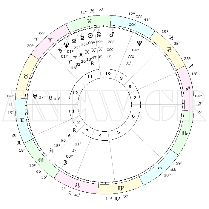 | | ΘΕΣΕΙΣ ΠΛΑΝΗΤΩΝ ΑΣΤΡΟΛΟΓΙΚΟΥ ΧΑΡΤΗ ΤΗΣ ΣΤΙΓΜΗΣ ΑΥΤΗΣ | | | | Πλανήτης | Ζώδιο | Μοίρες | Δεκαήμ. | Σε οίκο | Απόκλιση | | Ακμές των οίκων | | Ηλιος | Ιχθείς | 09°43' | Πρώτο | 11 | 07 S 56 | | 1ος | 04°39' | Ταύρος | | Σελήνη | Καρκίνος | 29°27' | Τρίτο | 4 | 23 N 33 | | 2ος | 05°36' | Δίδυμοι | | Ερμής | Ιχθείς | 22°14'R | Τρίτο | 12 | 00 S 09 | | 3ος | 28°42' | Δίδυμοι | | Αφροδίτη | Ιχθείς | 22°22' | Τρίτο | 12 | 04 S 17 | | 4ος | 20°25' | Καρκίνος | | Αρης | Υδροχόος | 28°12' | Τρίτο | 11 | 13 S 07 | | 5ος | 15°19' | Λέων | | Δίας | Καρκίνος | 15°17'R | Δεύτερο | 3 | 22 N 54 | | 6ος | 18°57' | Παρθένος | | Κρόνος | Κριός | 01°45' | Πρώτο | 12 | 01 S 16 | | 7ος | 04°39' | Σκορπιός | | Ουρανός | Ταύρος | 27°43' | Τρίτο | 1 | 19 N 28 | | 8ος | 05°36' | Τοξότης | | Ποσειδώνας | Κριός | 01°01' | Πρώτο | 12 | 00 S 48 | | 9ος | 28°42' | Τοξότης | | Πλούτωνας | Υδροχόος | 04°31' | Πρώτο | 10 | 22 S 53 | | 10ος | 20°26' | Αιγόκερως | | Β. Δεσμός | Ιχθείς | 09°05' | Πρώτο | 11 | 08 S 10 | | 11ος | 15°19' | Υδροχόος | | Ωροσκόπος | Ταύρος | 04°39' | Πρώτο | | | 12ος | 18°57' | Ιχθείς | | Μεσουράνημα | Αιγόκερως | 20°26' | Τρίτο | | | |