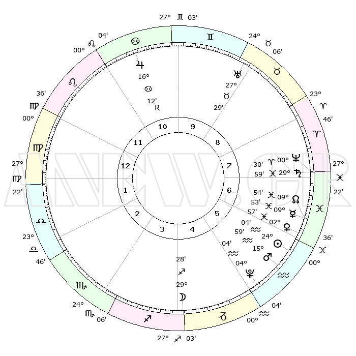 | | ΘΕΣΕΙΣ ΠΛΑΝΗΤΩΝ ΑΣΤΡΟΛΟΓΙΚΟΥ ΧΑΡΤΗ ΤΗΣ ΣΤΙΓΜΗΣ ΑΥΤΗΣ | | | | Πλανήτης | Ζώδιο | Μοίρες | Δεκαήμ. | Σε οίκο | Απόκλιση | | Ακμές των οίκων | | Ηλιος | Υδροχόος | 23°59' | Τρίτο | 6 | 13 S 32 | | 1ος | 02°18' | Παρθένος | | Σελήνη | Τοξότης | 28°26' | Τρίτο | 4 | 28 S 23 | | 2ος | 26°23' | Παρθένος | | Ερμής | Ιχθείς | 09°44' | Πρώτο | 7 | 08 S 19 | | 3ος | 25°16' | Ζυγός | | Αφροδίτη | Ιχθείς | 02°51' | Πρώτο | 7 | 11 S 49 | | 4ος | 28°12' | Σκορπιός | | Αρης | Υδροχόος | 15°55' | Δεύτερο | 6 | 17 S 05 | | 5ος | 02°14' | Αιγόκερως | | Δίας | Καρκίνος | 16°13'R | Δεύτερο | 11 | 22 N 46 | | 6ος | 04°01' | Υδροχόος | | Κρόνος | Ιχθείς | 29°58' | Τρίτο | 8 | 01 S 59 | | 7ος | 02°18' | Ιχθείς | | Ουρανός | Ταύρος | 27°29' | Τρίτο | 9 | 19 N 25 | | 8ος | 26°23' | Ιχθείς | | Ποσειδώνας | Κριός | 00°30' | Πρώτο | 8 | 01 S 00 | | 9ος | 25°16' | Κριός | | Πλούτωνας | Υδροχόος | 04°04' | Πρώτο | 6 | 22 S 57 | | 10ος | 28°12' | Ταύρος | | Β. Δεσμός | Ιχθείς | 09°54' | Πρώτο | 7 | 07 S 51 | | 11ος | 02°14' | Καρκίνος | | Ωροσκόπος | Παρθένος | 02°18' | Πρώτο | | | 12ος | 04°01' | Λέων | | Μεσουράνημα | Ταύρος | 28°12' | Τρίτο | | | |