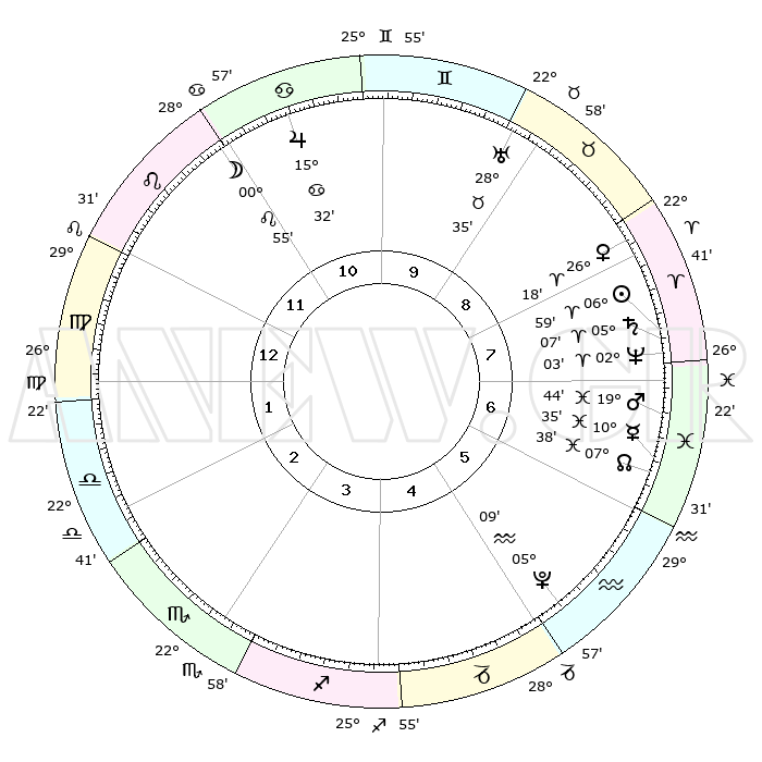 | | ΘΕΣΕΙΣ ΠΛΑΝΗΤΩΝ ΑΣΤΡΟΛΟΓΙΚΟΥ ΧΑΡΤΗ ΤΗΣ ΣΤΙΓΜΗΣ ΑΥΤΗΣ | | | | Πλανήτης | Ζώδιο | Μοίρες | Δεκαήμ. | Σε οίκο | Απόκλιση | | Ακμές των οίκων | | Ηλιος | Κριός | 06°56' | Πρώτο | 8 | 02 N 45 | | 1ος | 08°12' | Παρθένος | | Σελήνη | Λέων | 00°04' | Πρώτο | 11 | 23 N 20 | | 2ος | 02°53' | Ζυγός | | Ερμής | Ιχθείς | 10°33' | Δεύτερο | 7 | 08 S 06 | | 3ος | 02°13' | Σκορπιός | | Αφροδίτη | Κριός | 26°13' | Τρίτο | 8 | 09 N 33 | | 4ος | 05°10' | Τοξότης | | Αρης | Ιχθείς | 19°41' | Δεύτερο | 7 | 05 S 04 | | 5ος | 08°51' | Αιγόκερως | | Δίας | Καρκίνος | 15°31' | Δεύτερο | 11 | 22 N 54 | | 6ος | 10°15' | Υδροχόος | | Κρόνος | Κριός | 05°07' | Πρώτο | 8 | 00 N 05 | | 7ος | 08°12' | Ιχθείς | | Ουρανός | Ταύρος | 28°35' | Τρίτο | 9 | 19 N 40 | | 8ος | 02°53' | Κριός | | Ποσειδώνας | Κριός | 02°03' | Πρώτο | 7 | 00 S 23 | | 9ος | 02°13' | Ταύρος | | Πλούτωνας | Υδροχόος | 05°09' | Πρώτο | 5 | 22 S 48 | | 10ος | 05°10' | Δίδυμοι | | Β. Δεσμός | Ιχθείς | 07°38' | Πρώτο | 6 | 08 S 42 | | 11ος | 08°51' | Καρκίνος | | Ωροσκόπος | Παρθένος | 08°12' | Πρώτο | | | 12ος | 10°15' | Λέων | | Μεσουράνημα | Δίδυμοι | 05°10' | Πρώτο | | | |
