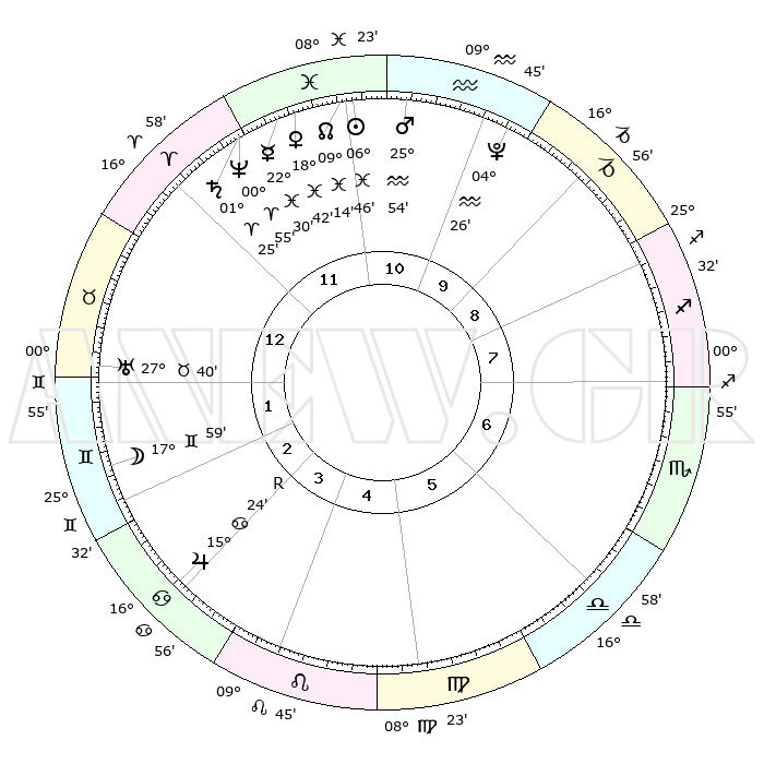 | | ΘΕΣΕΙΣ ΠΛΑΝΗΤΩΝ ΑΣΤΡΟΛΟΓΙΚΟΥ ΧΑΡΤΗ ΤΗΣ ΣΤΙΓΜΗΣ ΑΥΤΗΣ | | | | Πλανήτης | Ζώδιο | Μοίρες | Δεκαήμ. | Σε οίκο | Απόκλιση | | Ακμές των οίκων | | Ηλιος | Ιχθείς | 06°42' | Πρώτο | 11 | 09 S 03 | | 1ος | 01°03' | Ταύρος | | Σελήνη | Δίδυμοι | 17°06' | Δεύτερο | 2 | 28 N 01 | | 2ος | 02°59' | Δίδυμοι | | Ερμής | Ιχθείς | 22°29' | Τρίτο | 12 | 00 S 37 | | 3ος | 26°26' | Δίδυμοι | | Αφροδίτη | Ιχθείς | 18°37' | Δεύτερο | 12 | 05 S 48 | | 4ος | 18°08' | Καρκίνος | | Αρης | Υδροχόος | 25°51' | Τρίτο | 11 | 13 S 56 | | 5ος | 12°38' | Λέων | | Δίας | Καρκίνος | 15°24'R | Δεύτερο | 3 | 22 N 53 | | 6ος | 15°33' | Παρθένος | | Κρόνος | Κριός | 01°24' | Πρώτο | 12 | 01 S 24 | | 7ος | 01°03' | Σκορπιός | | Ουρανός | Ταύρος | 27°39' | Τρίτο | 1 | 19 N 27 | | 8ος | 02°59' | Τοξότης | | Ποσειδώνας | Κριός | 00°55' | Πρώτο | 12 | 00 S 50 | | 9ος | 26°26' | Τοξότης | | Πλούτωνας | Υδροχόος | 04°26' | Πρώτο | 10 | 22 S 53 | | 10ος | 18°08' | Αιγόκερως | | Β. Δεσμός | Ιχθείς | 09°14' | Πρώτο | 11 | 08 S 06 | | 11ος | 12°38' | Υδροχόος | | Ωροσκόπος | Ταύρος | 01°03' | Πρώτο | | | 12ος | 15°33' | Ιχθείς | | Μεσουράνημα | Αιγόκερως | 18°08' | Δεύτερο | | | |
