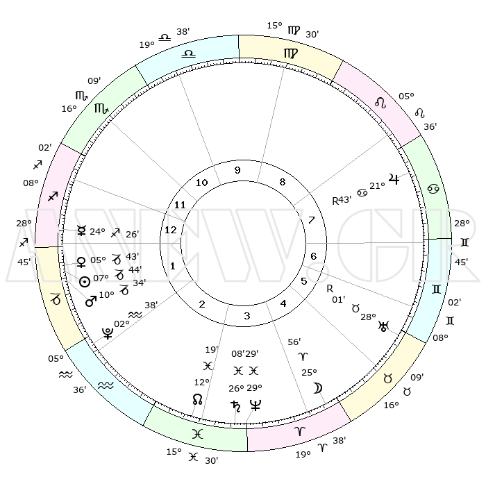 | | ΘΕΣΕΙΣ ΠΛΑΝΗΤΩΝ ΑΣΤΡΟΛΟΓΙΚΟΥ ΧΑΡΤΗ ΤΗΣ ΣΤΙΓΜΗΣ ΑΥΤΗΣ | | | | Πλανήτης | Ζώδιο | Μοίρες | Δεκαήμ. | Σε οίκο | Απόκλιση | | Ακμές των οίκων | | Ηλιος | Αιγόκερως | 07°39' | Πρώτο | 1 | 23 S 13 | | 1ος | 06°11' | Τοξότης | | Σελήνη | Κριός | 24°54' | Τρίτο | 5 | 12 N 54 | | 2ος | 08°15' | Αιγόκερως | | Ερμής | Τοξότης | 24°19' | Τρίτο | 1 | 23 S 33 | | 3ος | 14°60' | Υδροχόος | | Αφροδίτη | Αιγόκερως | 05°37' | Πρώτο | 1 | 23 S 43 | | 4ος | 21°05' | Ιχθείς | | Αρης | Αιγόκερως | 10°30' | Δεύτερο | 2 | 23 S 53 | | 5ος | 21°16' | Κριός | | Δίας | Καρκίνος | 21°43'R | Τρίτο | 8 | 21 N 55 | | 6ος | 15°30' | Ταύρος | | Κρόνος | Ιχθείς | 26°08' | Τρίτο | 4 | 03 S 37 | | 7ος | 06°11' | Δίδυμοι | | Ουρανός | Ταύρος | 28°01'R | Τρίτο | 6 | 19 N 31 | | 8ος | 08°15' | Καρκίνος | | Ποσειδώνας | Ιχθείς | 29°29' | Τρίτο | 4 | 01 S 26 | | 9ος | 14°60' | Λέων | | Πλούτωνας | Υδροχόος | 02°38' | Πρώτο | 2 | 23 S 14 | | 10ος | 21°05' | Παρθένος | | Β. Δεσμός | Ιχθείς | 12°19' | Δεύτερο | 3 | 06 S 56 | | 11ος | 21°16' | Ζυγός | | Ωροσκόπος | Τοξότης | 06°11' | Πρώτο | | | 12ος | 15°30' | Σκορπιός | | Μεσουράνημα | Παρθένος | 21°05' | Τρίτο | | | |