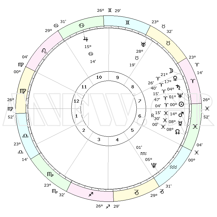| | ΘΕΣΕΙΣ ΠΛΑΝΗΤΩΝ ΑΣΤΡΟΛΟΓΙΚΟΥ ΧΑΡΤΗ ΤΗΣ ΣΤΙΓΜΗΣ ΑΥΤΗΣ | | | | Πλανήτης | Ζώδιο | Μοίρες | Δεκαήμ. | Σε οίκο | Απόκλιση | | Ακμές των οίκων | | Ηλιος | Ιχθείς | 29°60' | Τρίτο | 8 | 00 S 00 | | 1ος | 05°27' | Παρθένος | | Σελήνη | Κριός | 20°23' | Τρίτο | 8 | 11 N 11 | | 2ος | 29°52' | Παρθένος | | Ερμής | Ιχθείς | 08°30'R | Πρώτο | 7 | 07 S 25 | | 3ος | 28°60' | Ζυγός | | Αφροδίτη | Κριός | 17°35' | Δεύτερο | 8 | 06 N 06 | | 4ος | 01°57' | Τοξότης | | Αρης | Ιχθείς | 14°11' | Δεύτερο | 7 | 07 S 13 | | 5ος | 05°47' | Αιγόκερως | | Δίας | Καρκίνος | 15°14' | Δεύτερο | 11 | 22 N 55 | | 6ος | 07°21' | Υδροχόος | | Κρόνος | Κριός | 04°14' | Πρώτο | 8 | 00 S 16 | | 7ος | 05°27' | Ιχθείς | | Ουρανός | Ταύρος | 28°18' | Τρίτο | 9 | 19 N 36 | | 8ος | 29°52' | Ιχθείς | | Ποσειδώνας | Κριός | 01°47' | Πρώτο | 8 | 00 S 29 | | 9ος | 28°60' | Κριός | | Πλούτωνας | Υδροχόος | 05°00' | Πρώτο | 5 | 22 S 49 | | 10ος | 01°57' | Δίδυμοι | | Β. Δεσμός | Ιχθείς | 08°00' | Πρώτο | 7 | 08 S 34 | | 11ος | 05°47' | Καρκίνος | | Ωροσκόπος | Παρθένος | 05°27' | Πρώτο | | | 12ος | 07°21' | Λέων | | Μεσουράνημα | Δίδυμοι | 01°57' | Πρώτο | | | |