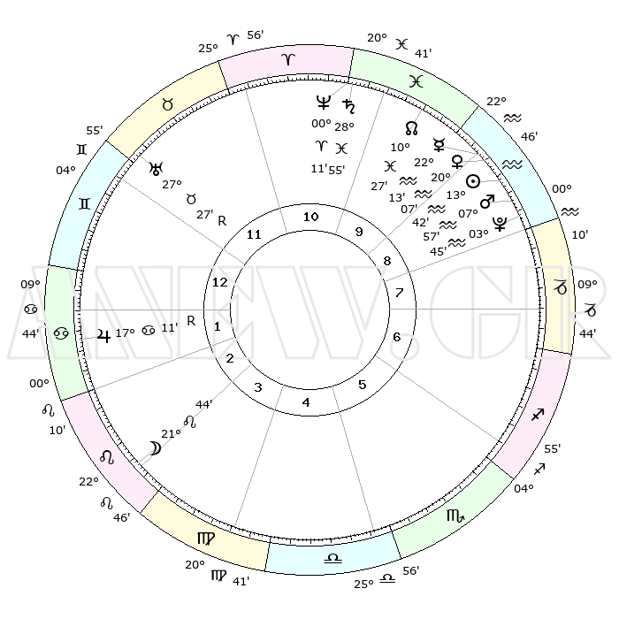 | | ΘΕΣΕΙΣ ΠΛΑΝΗΤΩΝ ΑΣΤΡΟΛΟΓΙΚΟΥ ΧΑΡΤΗ ΤΗΣ ΣΤΙΓΜΗΣ ΑΥΤΗΣ | | | | Πλανήτης | Ζώδιο | Μοίρες | Δεκαήμ. | Σε οίκο | Απόκλιση | | Ακμές των οίκων | | Ηλιος | Υδροχόος | 13°37' | Δεύτερο | 9 | 16 S 44 | | 1ος | 13°31' | Δίδυμοι | | Σελήνη | Λέων | 20°40' | Τρίτο | 3 | 16 N 10 | | 2ος | 05°59' | Καρκίνος | | Ερμής | Υδροχόος | 22°05' | Τρίτο | 10 | 15 S 50 | | 3ος | 27°12' | Καρκίνος | | Αφροδίτη | Υδροχόος | 20°02' | Τρίτο | 9 | 16 S 07 | | 4ος | 21°14' | Λέων | | Αρης | Υδροχόος | 07°53' | Πρώτο | 9 | 19 S 18 | | 5ος | 22°11' | Παρθένος | | Δίας | Καρκίνος | 17°12'R | Δεύτερο | 2 | 22 N 38 | | 6ος | 02°12' | Σκορπιός | | Κρόνος | Ιχθείς | 28°54' | Τρίτο | 11 | 02 S 26 | | 7ος | 13°31' | Τοξότης | | Ουρανός | Ταύρος | 27°27'R | Τρίτο | 12 | 19 N 24 | | 8ος | 05°59' | Αιγόκερως | | Ποσειδώνας | Κριός | 00°11' | Πρώτο | 11 | 01 S 08 | | 9ος | 27°12' | Αιγόκερως | | Πλούτωνας | Υδροχόος | 03°45' | Πρώτο | 9 | 23 S 01 | | 10ος | 21°14' | Υδροχόος | | Β. Δεσμός | Ιχθείς | 10°27' | Δεύτερο | 10 | 07 S 39 | | 11ος | 22°11' | Ιχθείς | | Ωροσκόπος | Δίδυμοι | 13°31' | Δεύτερο | | | 12ος | 02°12' | Ταύρος | | Μεσουράνημα | Υδροχόος | 21°14' | Τρίτο | | | |