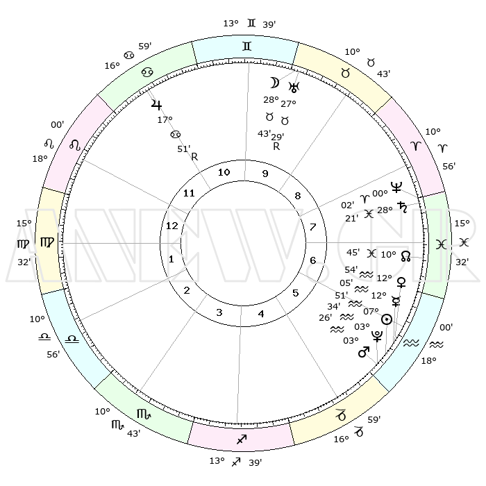 | | ΘΕΣΕΙΣ ΠΛΑΝΗΤΩΝ ΑΣΤΡΟΛΟΓΙΚΟΥ ΧΑΡΤΗ ΤΗΣ ΣΤΙΓΜΗΣ ΑΥΤΗΣ | | | | Πλανήτης | Ζώδιο | Μοίρες | Δεκαήμ. | Σε οίκο | Απόκλιση | | Ακμές των οίκων | | Ηλιος | Υδροχόος | 07°47' | Πρώτο | 6 | 18 S 19 | | 1ος | 26°03' | Λέων | | Σελήνη | Ταύρος | 27°45' | Τρίτο | 10 | 24 N 37 | | 2ος | 19°30' | Παρθένος | | Ερμής | Υδροχόος | 11°59' | Δεύτερο | 6 | 19 S 10 | | 3ος | 17°47' | Ζυγός | | Αφροδίτη | Υδροχόος | 12°49' | Δεύτερο | 6 | 18 S 12 | | 4ος | 20°38' | Σκορπιός | | Αρης | Υδροχόος | 03°23' | Πρώτο | 6 | 20 S 24 | | 5ος | 25°06' | Τοξότης | | Δίας | Καρκίνος | 17°51'R | Δεύτερο | 11 | 22 N 32 | | 6ος | 27°24' | Αιγόκερως | | Κρόνος | Ιχθείς | 28°21' | Τρίτο | 8 | 02 S 40 | | 7ος | 26°03' | Υδροχόος | | Ουρανός | Ταύρος | 27°29'R | Τρίτο | 10 | 19 N 24 | | 8ος | 19°30' | Ιχθείς | | Ποσειδώνας | Κριός | 00°02' | Πρώτο | 8 | 01 S 12 | | 9ος | 17°47' | Κριός | | Πλούτωνας | Υδροχόος | 03°34' | Πρώτο | 6 | 23 S 03 | | 10ος | 20°38' | Ταύρος | | Β. Δεσμός | Ιχθείς | 10°45' | Δεύτερο | 7 | 07 S 32 | | 11ος | 25°06' | Δίδυμοι | | Ωροσκόπος | Λέων | 26°03' | Τρίτο | | | 12ος | 27°24' | Καρκίνος | | Μεσουράνημα | Ταύρος | 20°38' | Τρίτο | | | |